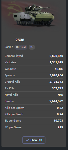 >>50698527 >Зенитка. Без радара. Без захвата цели. Медленная. Можно убить сразу двух из трёх членов экипажа одной удачно выпущенной короткой очередью из пулемета 12,7мм в башню. Пробитие APHE-I ленты на 100м - 50/39/20мм. >Без APDS в ленте хуже чем Енисей с БР 7.7 с радаром и пробитием 83/61/31 на 100м, и где-то на уровне ранней Шилки с БР 7.3 без радара и с примерно равным пробитием. >Да, норм, заебись. Оставляем на 8.3. Да они ебанулись.