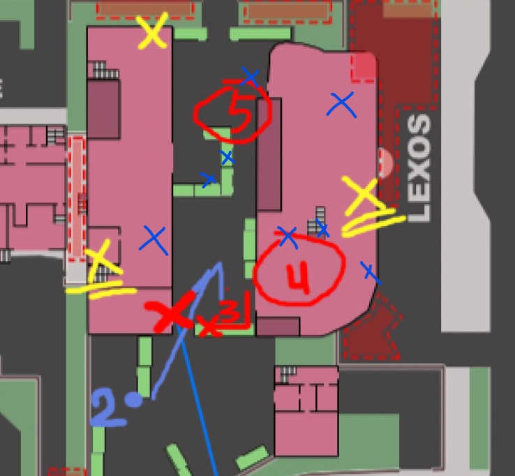 Чел который боится Кабана, вот рабочий сетап. На подходе убираешь сверху снайперов, лучше всего с позиции где цифра 1 или ниже, как получится. желтые кресты это они. обычно их там 3, но нужно убить только 2 внизу, третий страдает херней и можно его ваще не трогать если не мешает. встаешь у колонны где цифра 1 у стеночки дома , аккуратно целишься чтоб показался край свитовца и через проходик раздвижной двери выцеливаешь еблана с пулеметом, если страшно - кидаешь грену через забор, он убегает, и в любом из вариантов - забегаешь на позицию 2, идеальное место чтоб убивать всю свиту. Кидаешь оттуда грены если надо пошугать народ, иногда на позицию 3 забегает чел на контейнер - его легко снять он как утка там бегает, главное не дать ему начать стрелять. Иногда тебя может пушить чел но он там бежит ровно прямо на тебя, его снять как нехуй делать, можно даж зайти внутрь своего сейва и там его подождать. Иногда тебе могут грену кинуть внутрь но редко.забежать внутрь контейнера там и ты в сейве полном. Когда всех убил , можно идти внурь пушить Кабана, он иногда стоит либо на позиции 4, либо 5. Сложности он не представляет, просто зажимаешь в него. Снупир третий может настреливать в тебя когда ты уже внутри, убить его легко. Собсна всё. Фармится так оч легко, главное не подходить к воротам в начале а то пулеметчик может нашить и через ворота.