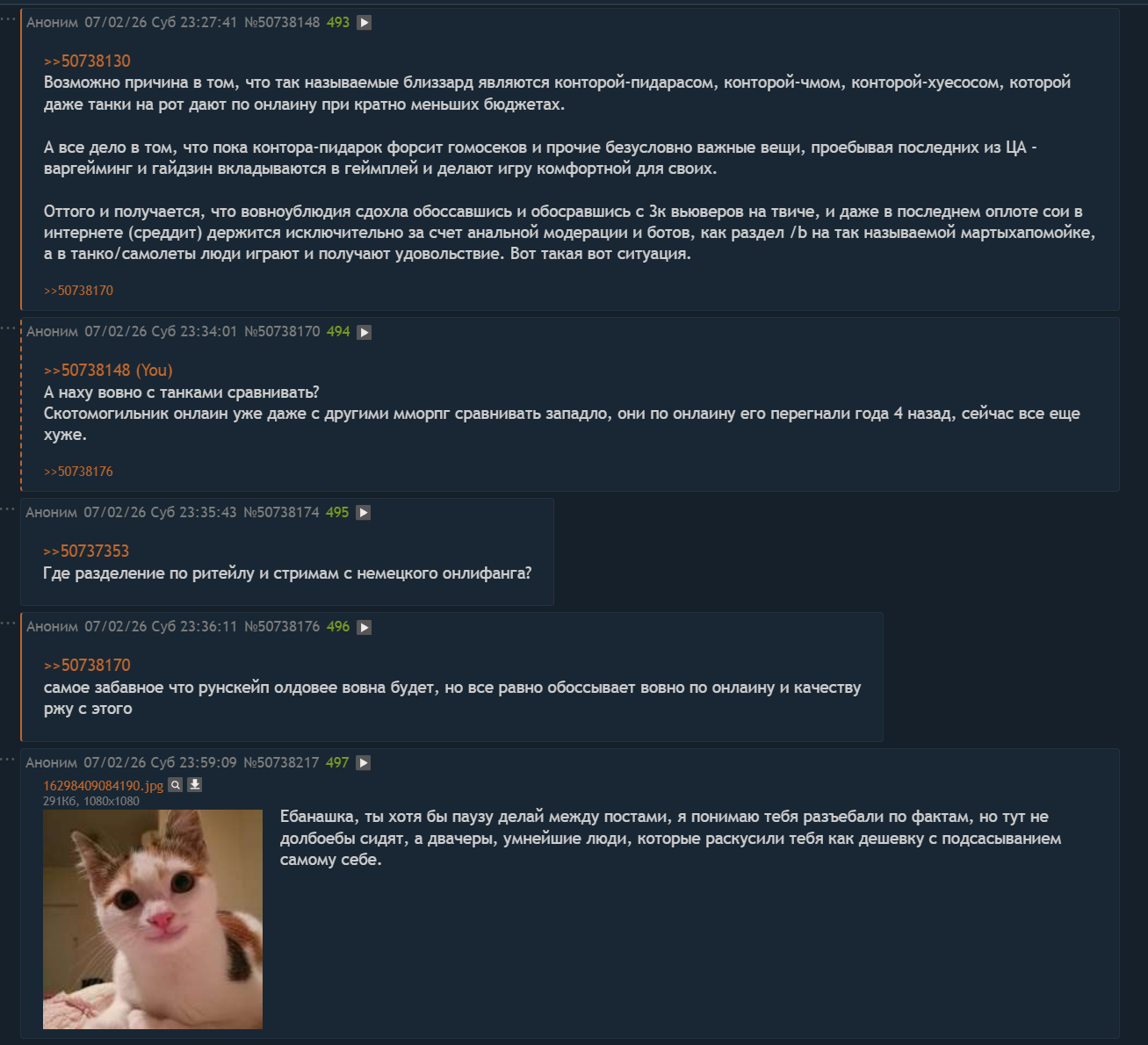 >>50725596 Челибос, мне ещё хуже. Я играю с середины БК и ВоВ это часть моей жизни, с ним связано очень много хорошего, я там повстречал много знакомых, много общался с людьми. То что случилось - это ужасно.