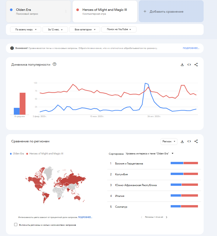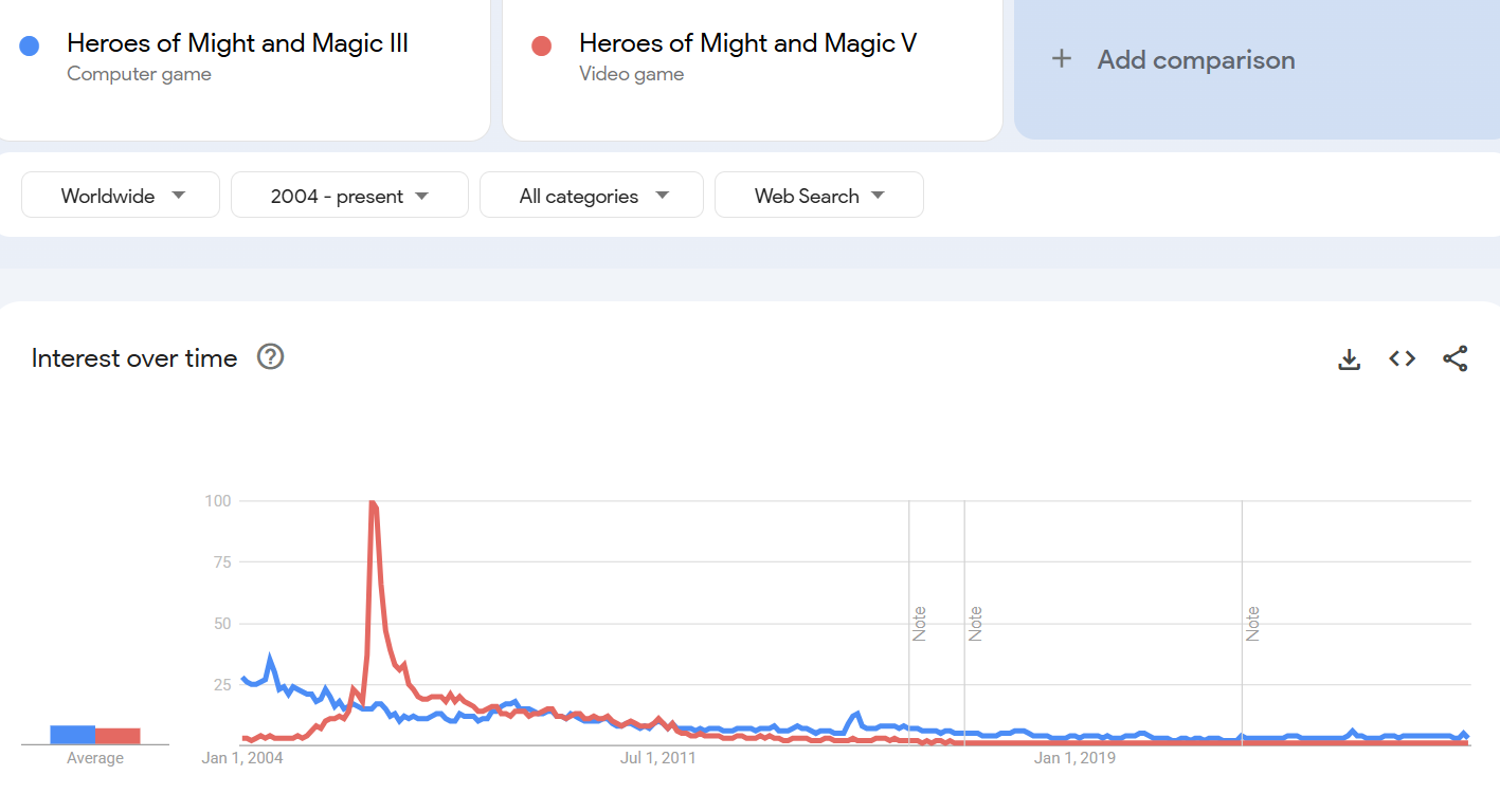 То есть подведем итог судя по графику Герои 3 спустя 4 года без каких либо обновлений во времена, когда компьютер был роскошью показывают данные в 1000 раз больше чем Калдэн Эра в день БЕСПЛАТНОГО релиза на момент 2025 года, когда компьюетр это, стандартный предмет интерьера и интернетом пользуются в миллиард раз больше людей чем во время релиза тройки.