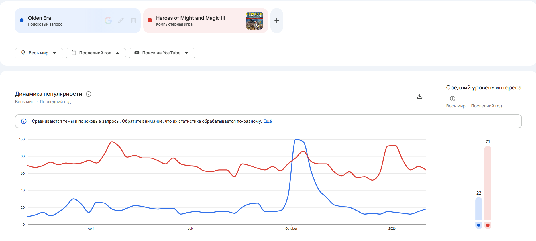 А вот у нас данны по трендам на Ютубе в промежутке за этот год. То есть за этот год контент по КЭ смотрять в 6 раз меньше чем по игре 26летней давности.
