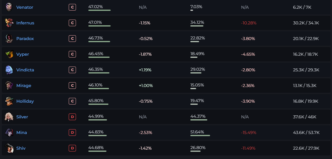 Венатор - выглядит наиболее подходящим к стилистике игры и менее геншиново из всех персонажей. Но геймплейно слабый и занимает непонятную нишу. Как ганнер-ЛКМщик - есть персонажи лучше него (wraith, haze), как антитанк-антихил - аналогично на любого хорошего ЛКМщика просто покупается антихил айтем и для этого не нужен отдельный персонаж. Который еще и очень тормозной и с относительно слабым китом (например, никакого ескейпа нет). Кроме того, чтобы раз в катку наконец-то попасть по какому-то калеке ультой - как будто нахрен и не нужен.