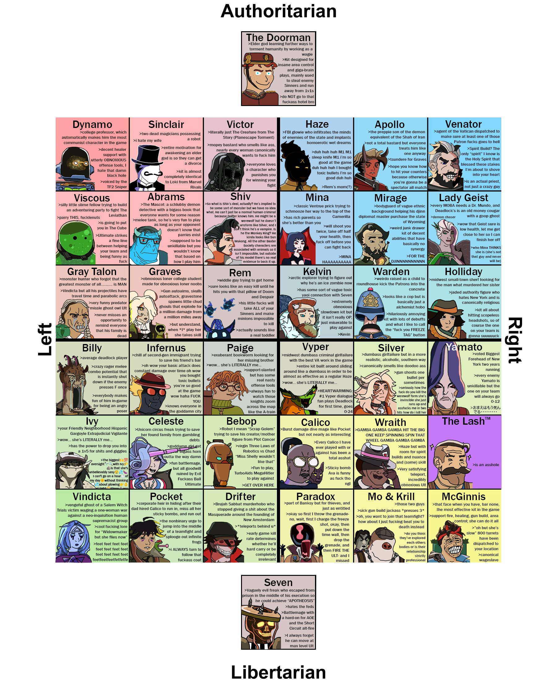 Нет, персонажи мне нравятся. Красочные, стильные, лорные. Но механики некоторых персонажей это пиздец, с ассоциативной точки зрения.