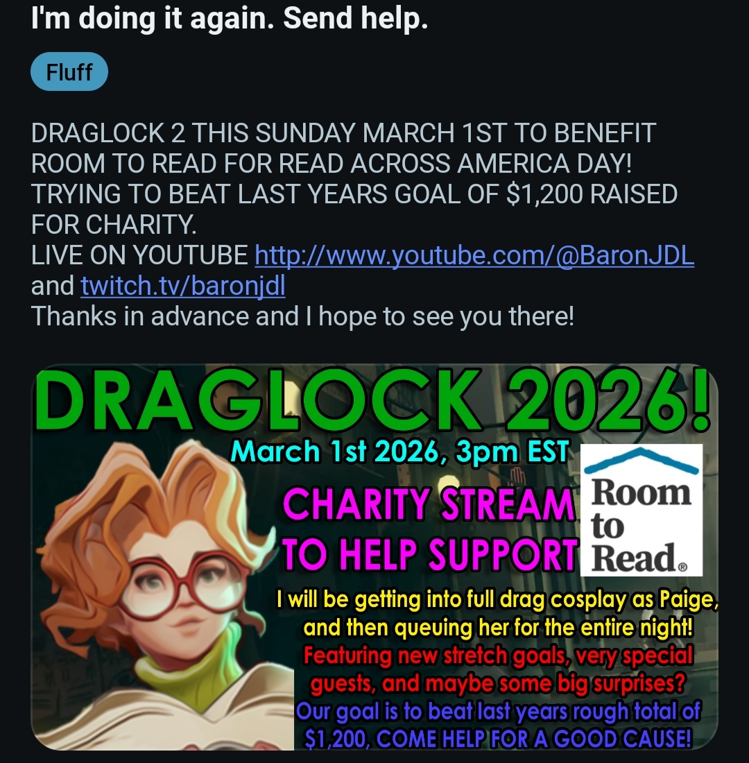 >>50805206 Какой то радужный реддитор-пидорок второй год подряд будет проводить благотворительный стрим по дедлоку под названием Драглок. Будет переодеваться в женского перса и целый день стримить.в этот раз за Пейдж.