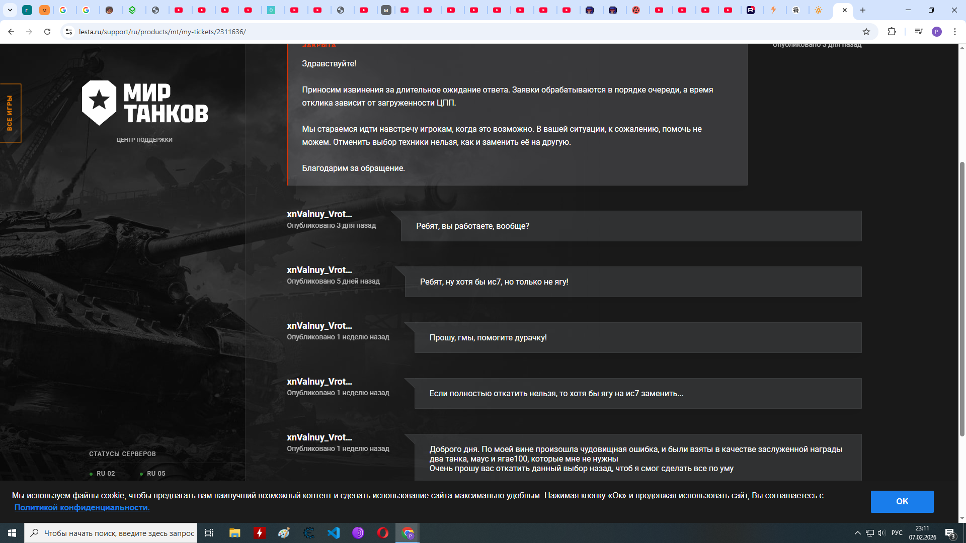 Конец истории о том, как я бухим выбрал две говны вместо нормальных танков за заслуженную награду Конечно, я видел пост чела с аналогичной проблемой, где ему не помогли, но все равно была вера в чудо Причем поддержка всегда мне помогала с хуйней, которую я вытворял бухим, но почему-то именно тут оказалась бессильной, лол На днях еще бухим уничтожил оборудку трофейную вместо переоборудки, лол. Заявку уже создал