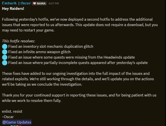 Я думаю идея такая: с неба падает зонд, с ним можно взаимодействовать и на твоей карте появляется постоянная метка игрока, который убивает арков. Когда ты устранишь этого игрока, с неба прилетает еще один зонд, но уже с наградой: ценные детали арков вроде ядер и прочие компоненты. Таким образом игроки, которые заинтересованы только в пвп, будут получать детали с арков для крафта.