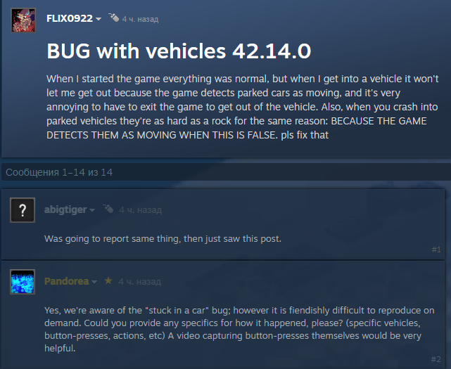 >В стиме писали про невидимый огонь и застревание в машине Тоже где-то читал про это. Жди хотфиксов, они обычно в течении недели после релиза крупного патча выходят. А учитывая что сейчас любая обнова ломает сейвы, я бы вообще подождал 42 релиза.