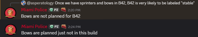 Я еще почему-то уверен, что луки будут одной из первых вещей, которой займутся в 43 билде. Потому-что в принципе уже давно можно понять что у разрабы приоритеты идут сугубо по ударившей в голову моче. И если он захотел сделать луки, то он будет жопу рвать и пытаться встроить свои ебаные луки, забив хуй на все остальные проблемы игры.