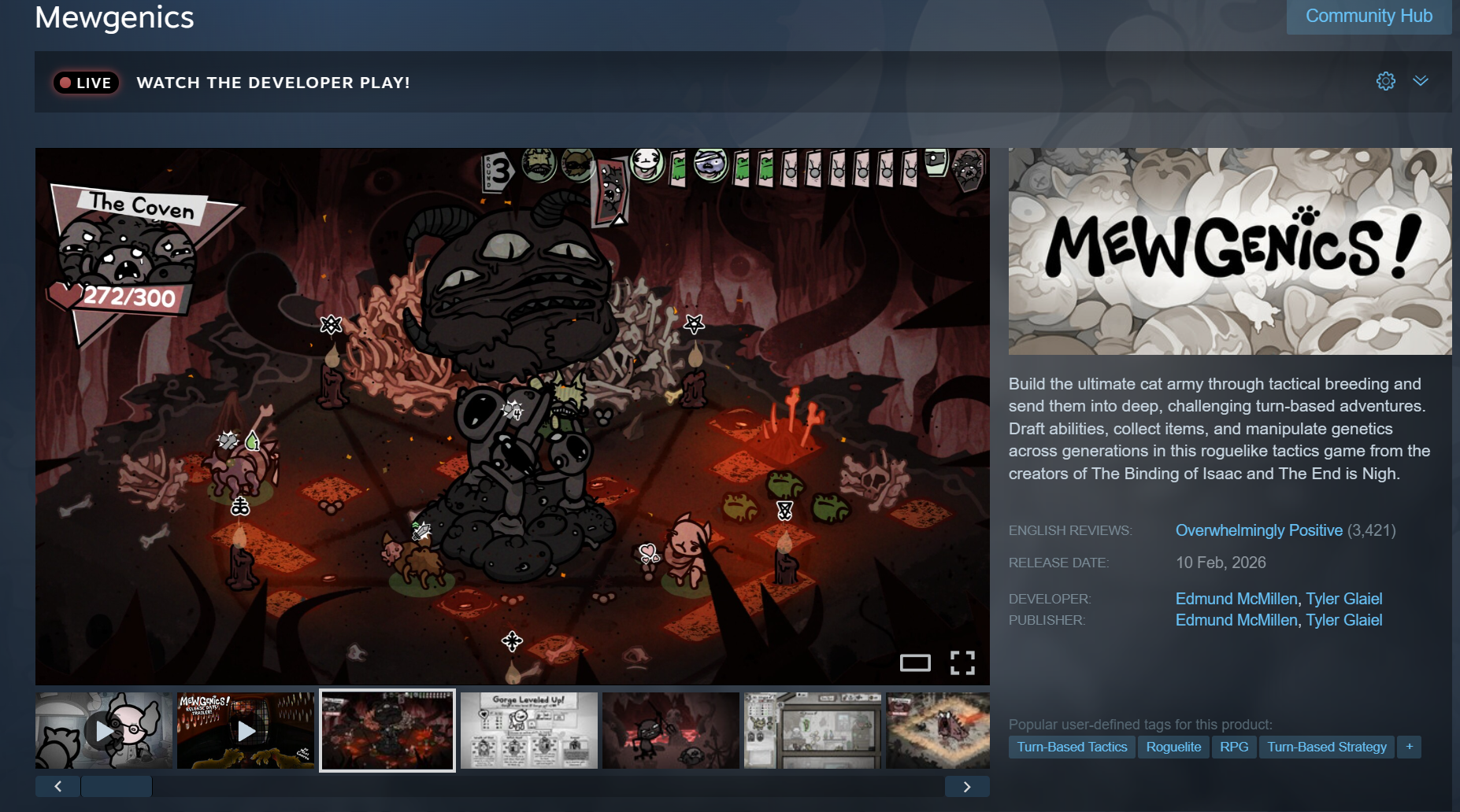 Чет-т хуй знает, как-то скучно. Раны долгие и затянутые, рандома дохуя, миллион косяков по UI. Никакого mewgenics нет - разведение нахуй не нужно, т.к. один хуй скиллы наследует 1 кот из 50, и то они рандомные (это может дальше по игре как-то и станет лучше, но подавалось как кор-механика, т.е. должна на всех этапах игры как-то присутствовать, а сейчас вообще не ощущается). Да и менеджить котов с таким уебанские УИ та еще боль. В общем хуй знает, игра не говно, но и не охуенная, тупо середнячок.