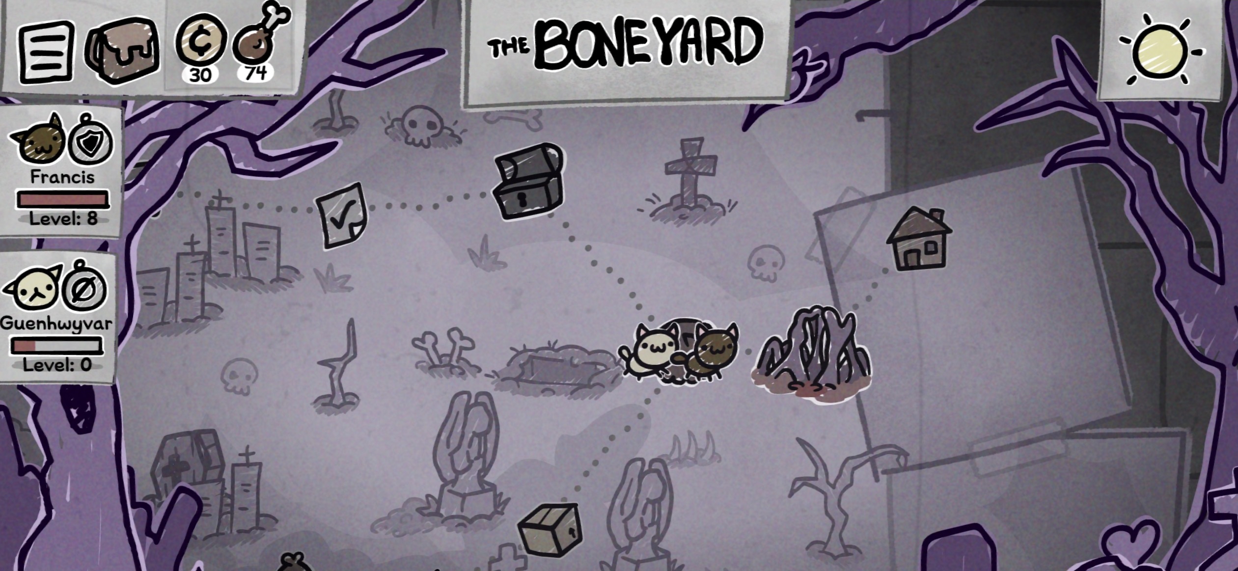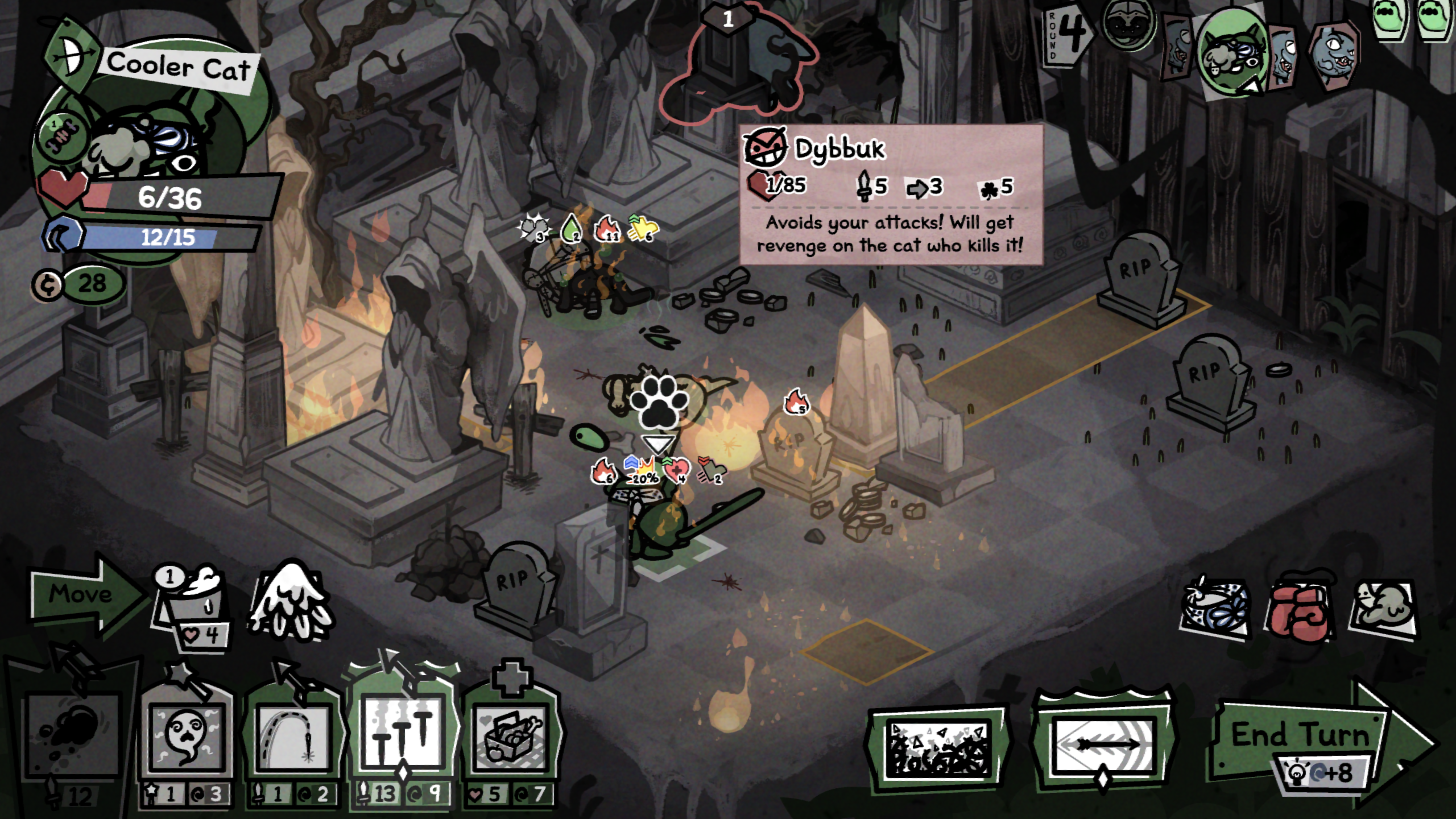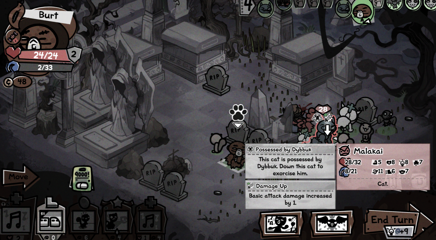 Кладбище Пройдено. Там супер душный финальный босс. Он короче уклоняется от всех атак. Его нельзя ранить прямыми тычками. Только зарядами которые летят по линии например. Или поджечь нахуй всю локу, чтобы он по огню катался. Короче нельзя его просто бить, нужно как-то изъёбываться. Он может вселиться в твоего кисика и взять над ним контроль. Выгнать его можно только победив тиммейта. Собрал ещё более йоба снайпера. Он короче может сам выращить Траву, у него рарный платок, который ещё на 40 процентов повышает уклонение в траве. Плюс он входит в стелс. Плюс бандана ещё на 25 процентов уклонения. Короче пока он стоит в траве у него более 100% уклонение. Он может пропускать ходы и копить атаки. Просто стоишь в стелсе, пока остальные дерутся, потом вылетаешь и выпускаешь всё это в босса. После Кладбища открылась Пустыня.