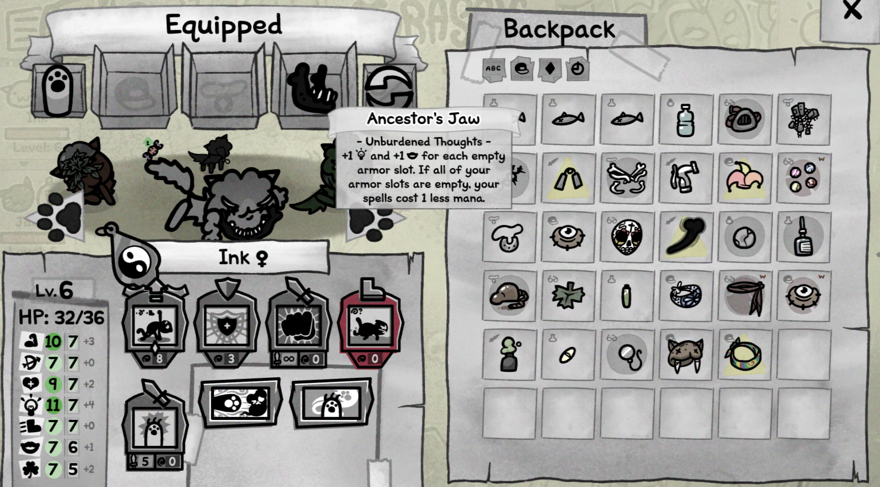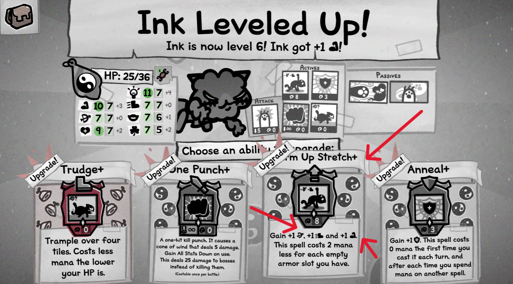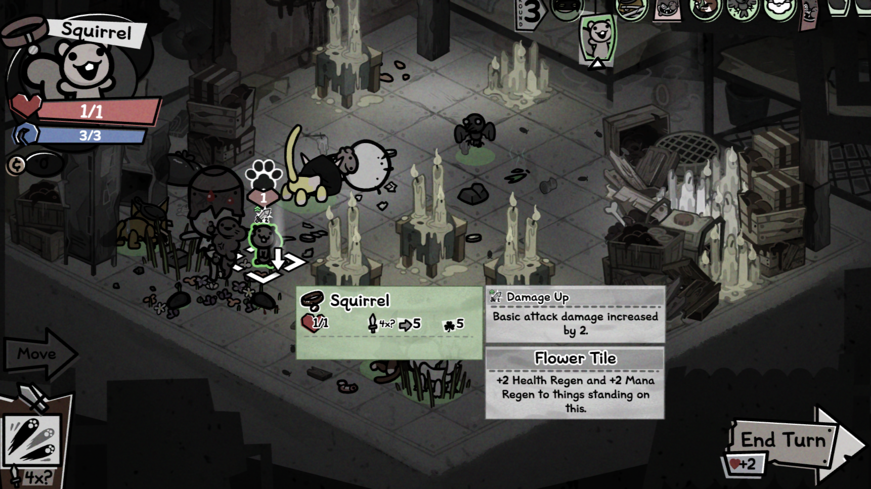 Монах имба. Фишка этого класса короче в том, что твой кысенька становится шаолиньским монахом и сражается без всего. У него куча скиллов и пассивок завязаны на то, что у тебя в его слотах брони ничего нет. Как видите мой кисик за каждый пустой слот брони создаёт себе защиту, за каждый пустой слот брони отрегенивает себе манну, можете посмотреть на его реген. У него скилл увеличивающий урон за каждое движение. Если ему хиллер или друид заливают ходы, он может разогнать это заклятие до запредельных цифр. Монах атакует два раза в ход, может переключать стойки с ближней и дальней атаки. Мой кисик ещё отвечает на каждое движение атакой. Если босс его толкает, он бьёт. Ещё у него есть контратака если враг в зоне поражения его удара. Посмотрите сколько панчей. Винчун какой-то!1 Это я ещё без друида. Если друид ему урона зальёт это ваще пиздец будет.