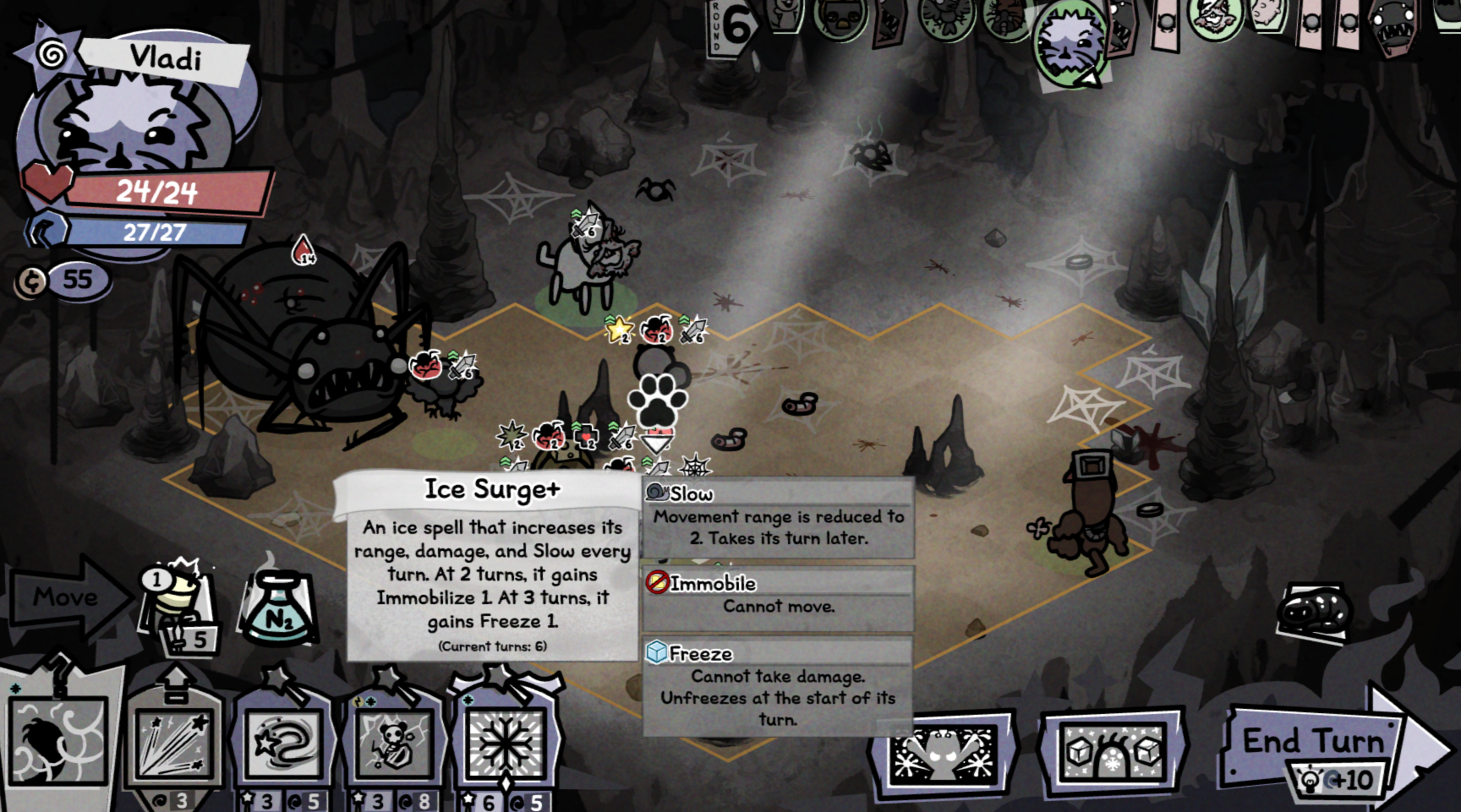Собрался вот ледяной маг... нахуй нужен эффект заморозки в этой игре? Вот посмотрите на прокаченное имба-заклятие ледяное. Оно каждый ход увеличивает свой радиус, урон и замедление. Круто, растёт дамаг, замедление, обездвиживание. Можно полностью стопнуть босса к концу битвы. Нахуй нужна заморозка? Она не даёт наносит урон врагу. Для чего в битве нужен этот эффект? На своих его не наложишь, это заклятие кучу дамага наносит. Лёд это самая бесполезная хуйня.