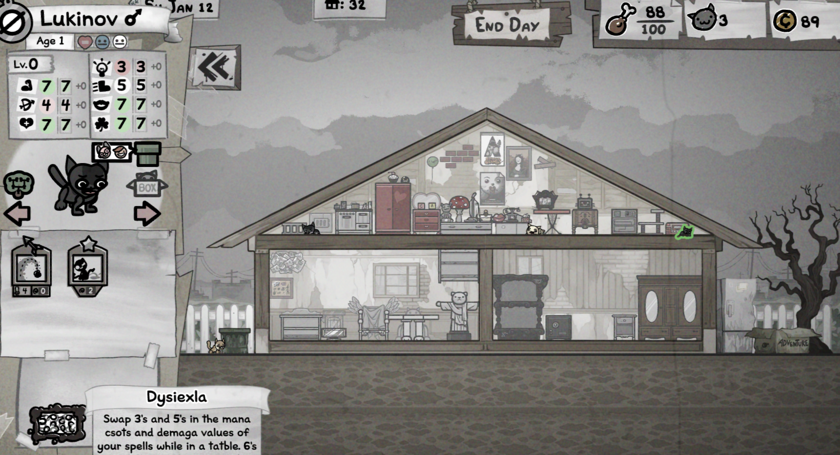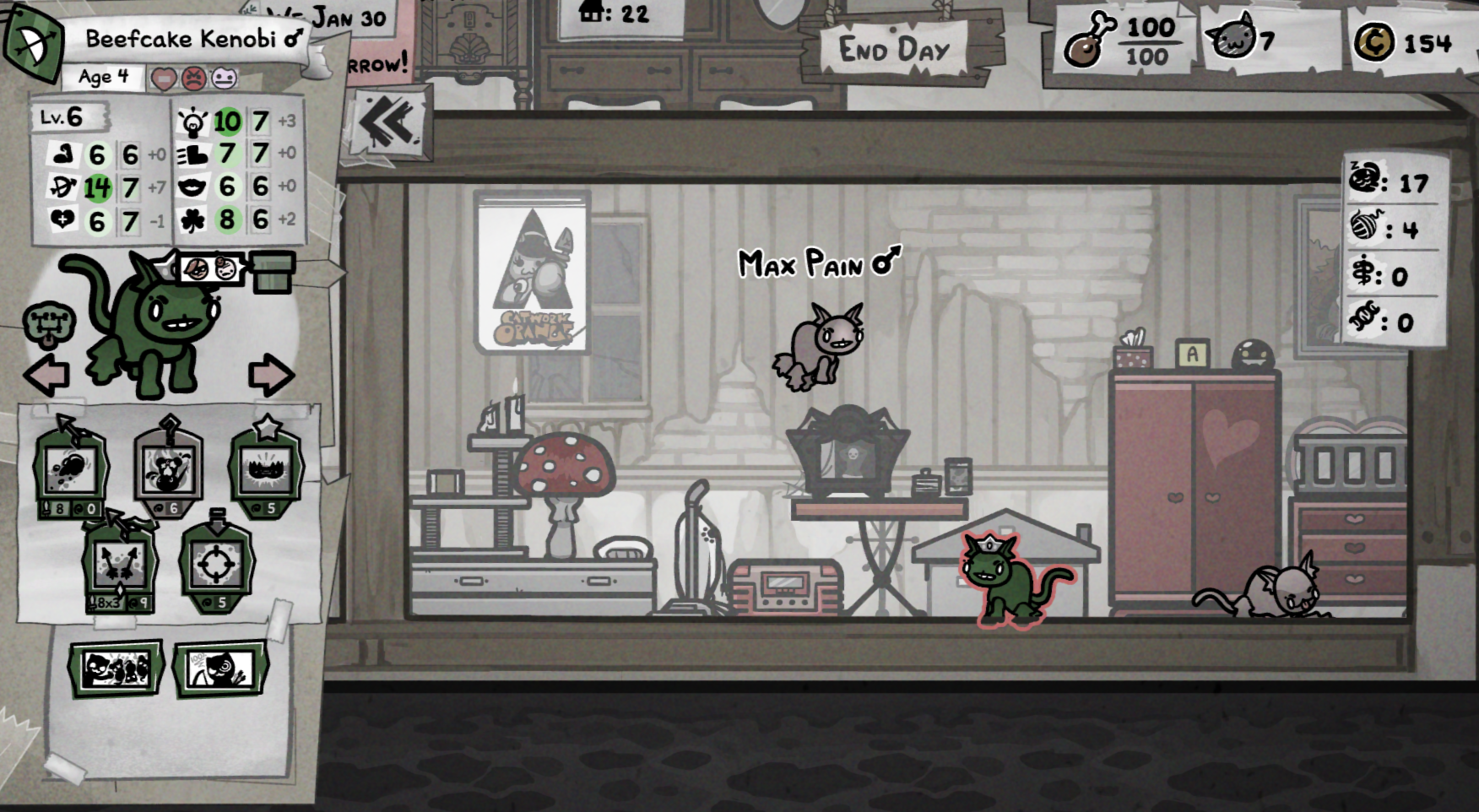Можно, к слову, даже бойцовский клуб сделать выделив для этого отдельного комнату, где кошаки будут пиздиться если низкий комфорт, но прикол в том, что лузеров можно убирать, а победитель получает трейты, что потом можно закрепить в потомстве.