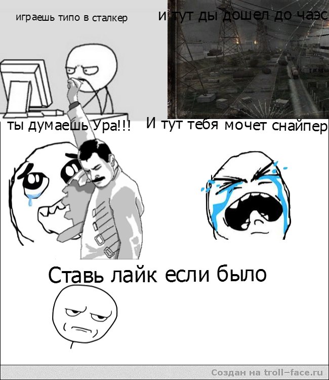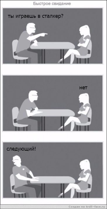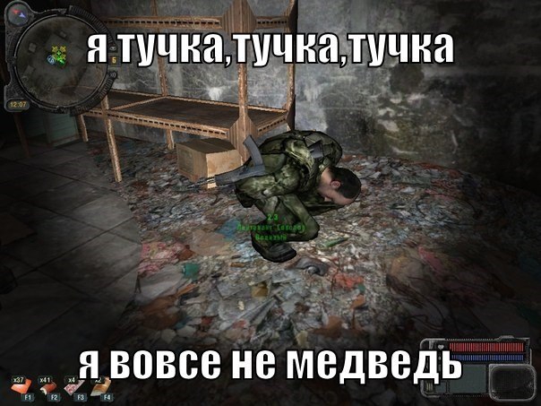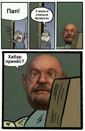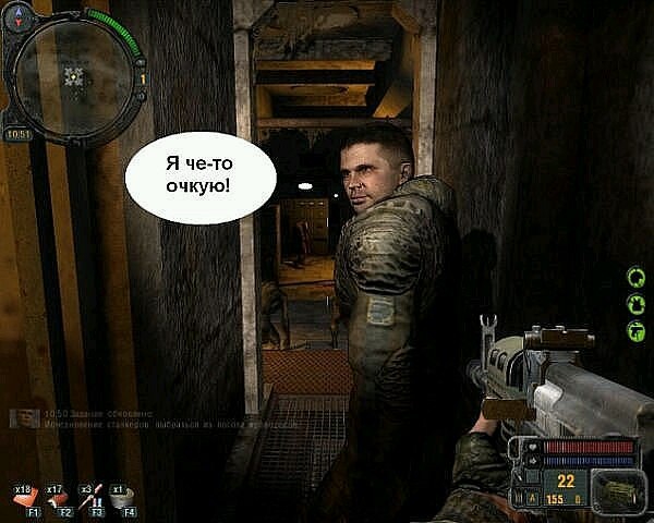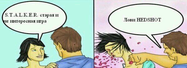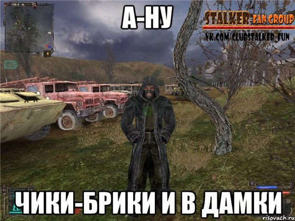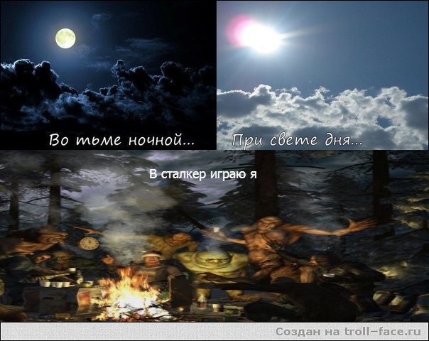 Идет сталкер ночью по Зоне, и тут вдруг видит: старые домики стоят, а в одном из домиков свет горит. Сталкер обрадовался, думает: "Сейчас к своим приду, похаваю, отосплюсь…" Тут глядь, какой-то мужик рядом маячит. Ну сталкер подумал, что это бандит. Подходит к нему тихонько, и за горло удушающим хватает и говорит: - Ну все, козел, молись! И тут этот мужик сдавленным голосом говорит: - Хватит, сталкер! Что уже, нормальному кровососу и отлить негде!?