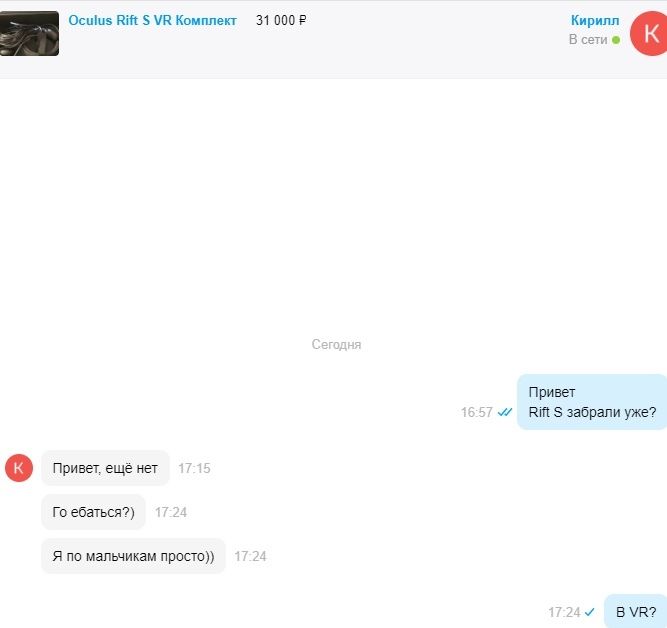 Анон, насколько рискованно брать на авито с доставкой из дс в мою мухосрань? Иногда появляются предложения с rift s за 20-25к (в причине продажи везде пишут что мол НАИГРАЛСЯ), но что-то ссу брать кота в мешке, вдруг придет поебанная хуйня или курьер короной заразит?