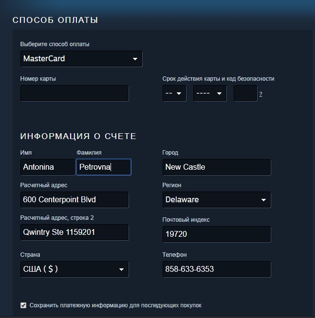 >>13175 >>13175 Очевидно, при оплате картой ты укажешь имя и фамилию с карты. А доставят на имя и адрес, которые ты укажешь в личном кабинете бандерольки. Карты ты можешь хоть каждый раз использовать на новое имя, это пофиг ваще. Стим не проверяет. Биллинг адрес (город, улица...) укажешь от Бандерольки (такой же, как и шиппинг), реальный русский биллинг адрес не проканает, стим будет ругаться, что не США. Подложность биллинг адреса Стимом тоже не проверяется.
