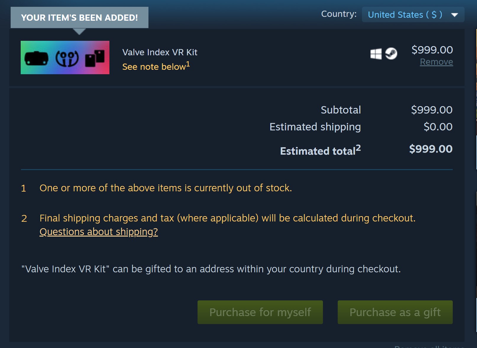 >>13229 Ты ебобо? Где дохуя? На амазоне б/у продают за 1500$. На ebay б/у тоже около 1000-1500. А вот в стиме за 999$ уже out of stock и поставки только начиная с Февраля 2020 года. Хотелось бы, чтобы Valve всё таки делала больше индексов, а то не хватает.