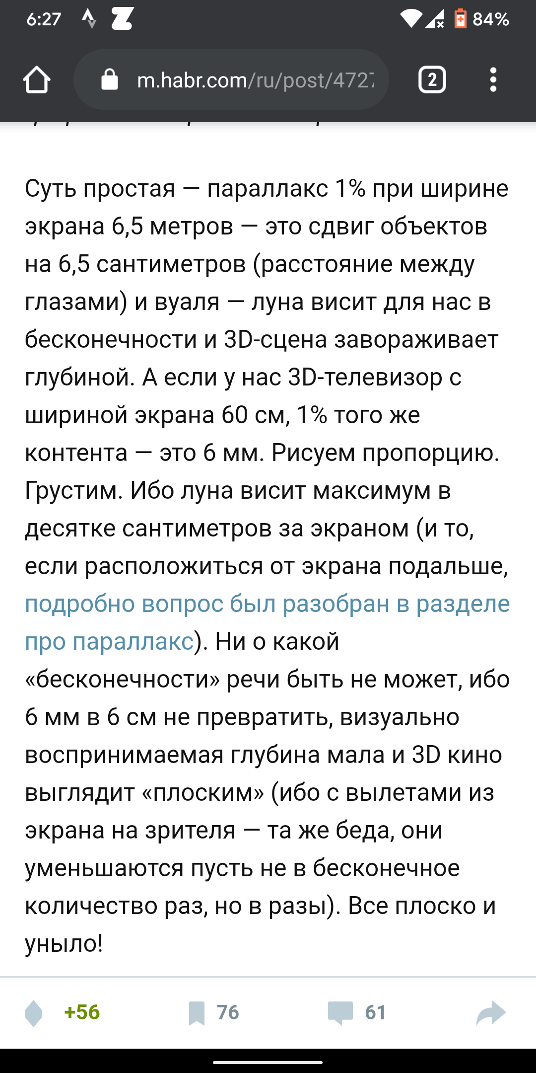 На качественных 3д фотокарточках эффект глубины / обьем намного выраженее смотрится. Ну тоесть видно выпирающий нос или пряди волос по отношению к лицу. А вот в кино только +-3 плана. Перед мутный, гг центр и фон. Какого хуя? Даже в порнухе 3д эффет лучше. Оффсет я ставил на максимум, глаза косить начинают а лица все равно плоские как блин.