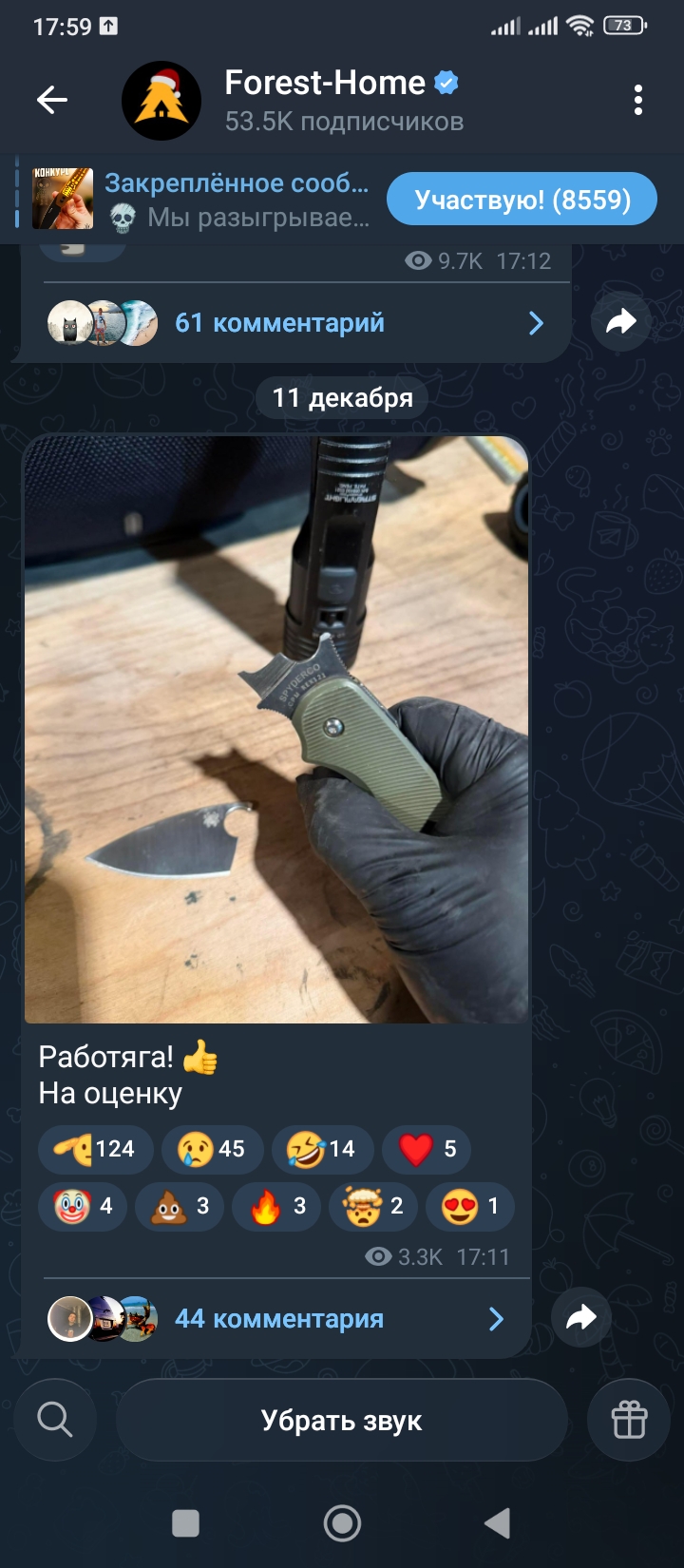 >>1002911 >О, это от ОК knives? Ага, они. >Тоже хотел взять у них, но они отказались отправлять, говорят и так на таможне задержали у них большую партию. Очень странная херня, ведь это абсолютно легальный спиннер. Если так рассматривать, у него даже поражающие свойства довольно сомнительные. Для меня это вообще не нож, а чисто спиннер-игрушка. Максимум открыватель упаковок, и то это куда приятнее делать кинжалом. Кстати, из-за этого многие фронталки идут 2 посылками в разобранном виде. Даже легальные ультратеки. >Как по стали на клиночке? вг10 или пиздят? ОК в пиздеже замечены не были. Заявлено VG10. Были тесты и с М390, вроде +/- норм. От себя могу сказать что проверял твёрдость, и заявленных 63 HRC там было.