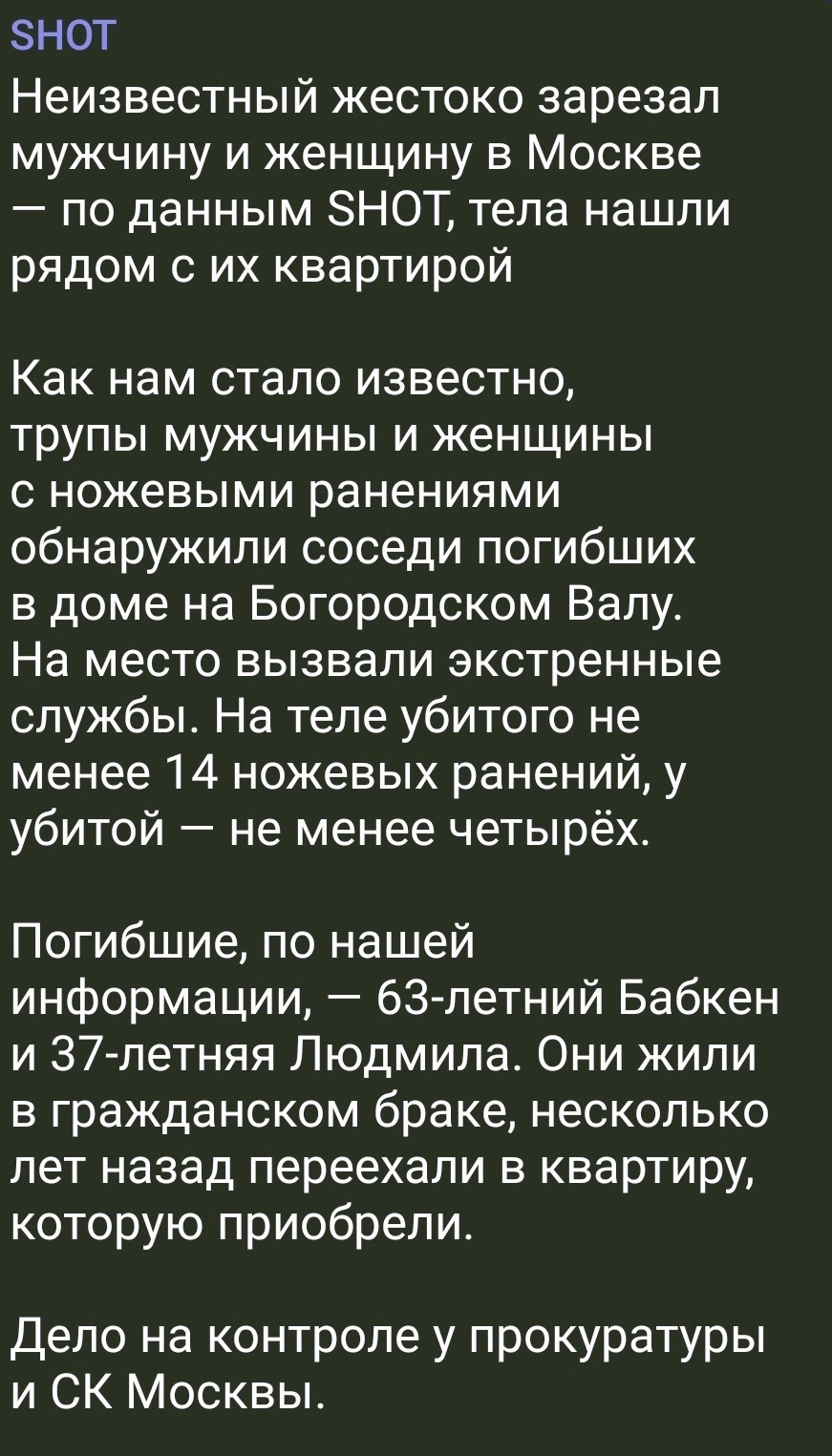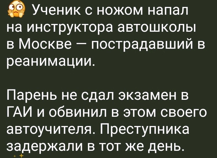 По информации SHOT, Платон из 8В по договорённости с учительницей пришёл сегодня в школу раньше, к 07:10, чтобы исправить контрольную по математике. Когда преподаватель отвернулась, подросток ударил её ножом в спину. Затем нанёс ранения себе. Обоих госпитализировали.