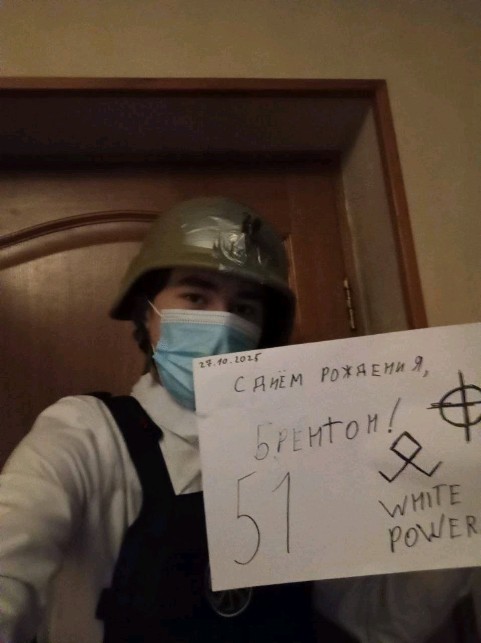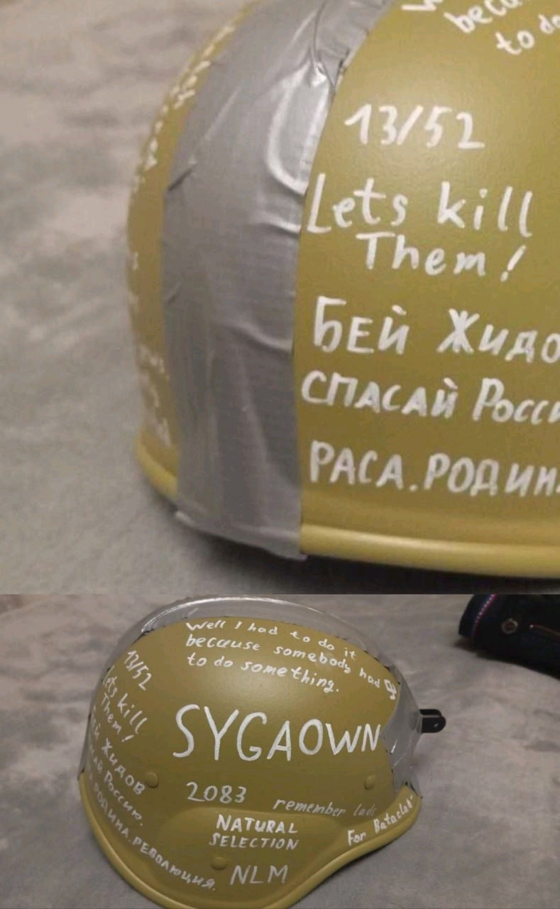 Также подросток запечатлел собственную каску, разрисованную экстремистскими цитатами и названиями праворадикальных организаций. В частности, на ней было нанесено слово «Sygaown» — отсылка к массовому расстрелу в США 2022 года