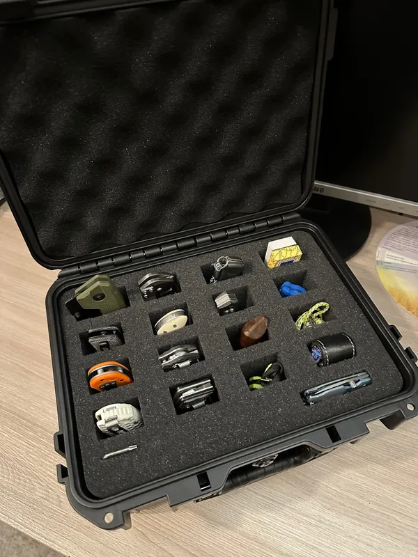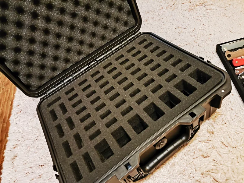 Изучил рынок кейсов. Все что продается с поролон с квадратиками, не сильно долговечное наполнение: перегородки отрываются, клипсы их повреждают и т.д. Размер квадратиком 12.5 мм в среднем, пример размещения для ящика с пика - расстояние по 2 квадратика, что бы перегодоки не рвались быстро. По идеи надо внутренности делать из вспененного полиэстера и вырезать. Все что с таким стоит много. Так что выбора и нет. Покупаешь с поролоном ,когда порвется делаешь из полиэстера, в теории есть фирмы которые его режут лазером.