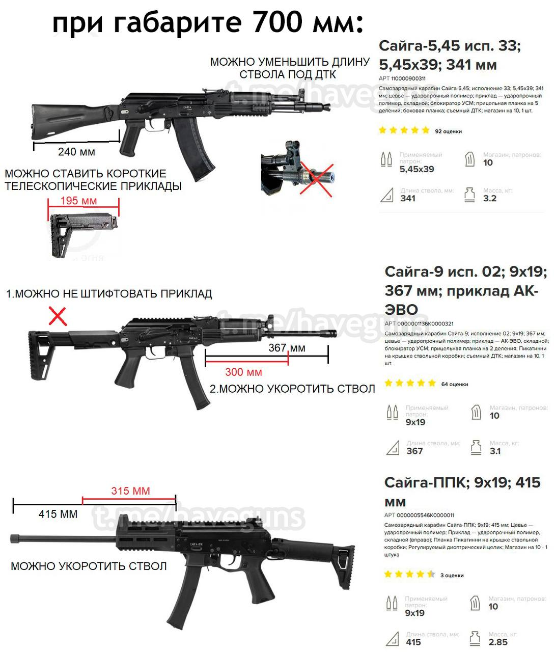 Идеальным оружием с длиной ствола 300 мм и общей длиной 700 мм я считаю карабин в пистолетном калибре 9х19\7.62х25. Он должен работать с закрытого затвора. В сложенном состоянии должен быть максимально компактным.