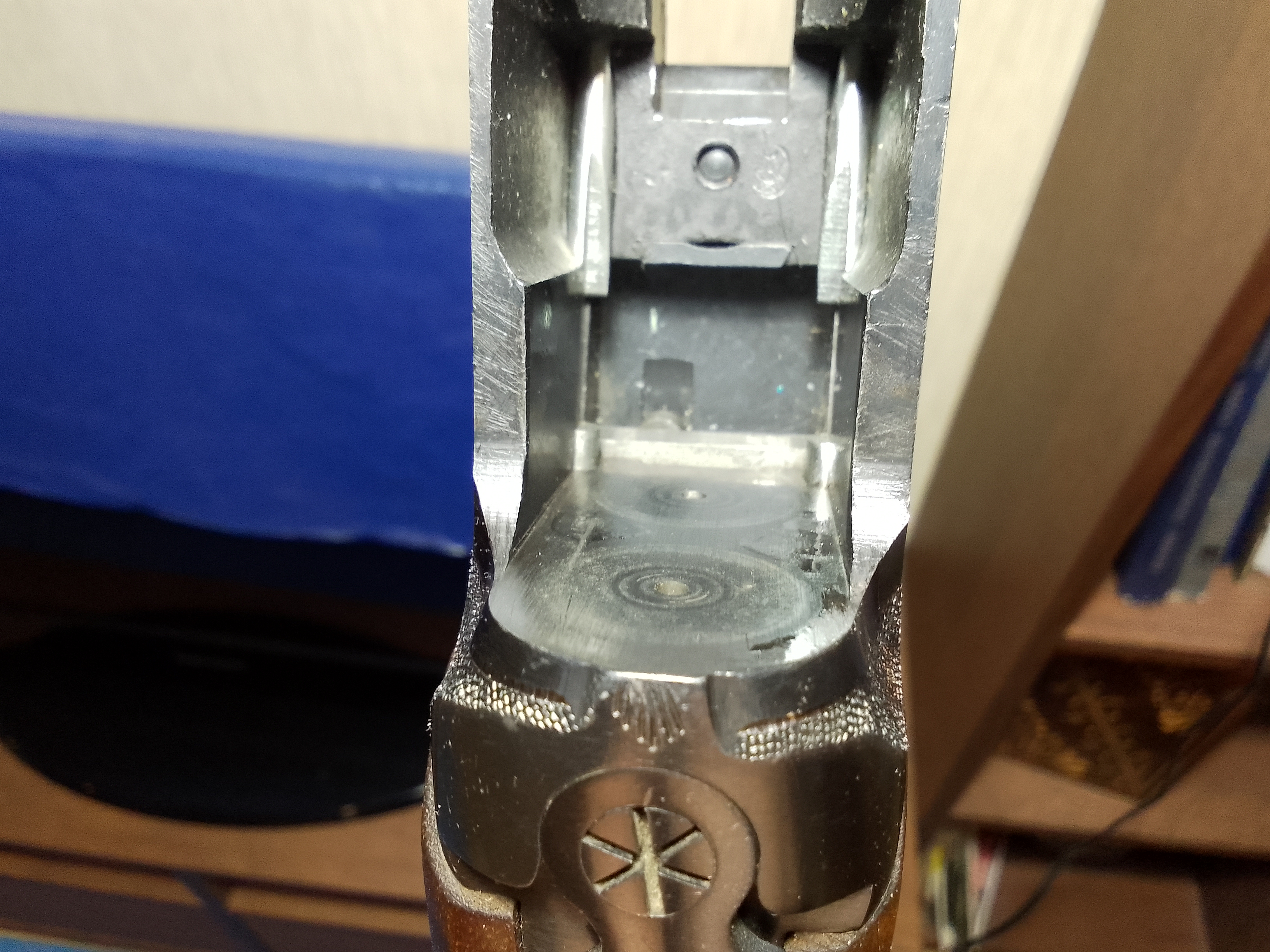 ну и на затворе при реальном настреле а не холощении круги и прочие наклепы от гильзы, при холощении там обычно только латунированное покрытие донышка может пошкрабать и латунь вытирается пальцем без следов >>1006828 в нарези обязательно чистить, в гладком лишним не будет, особенно если ствол уже пожил и появилась сетка или сколы