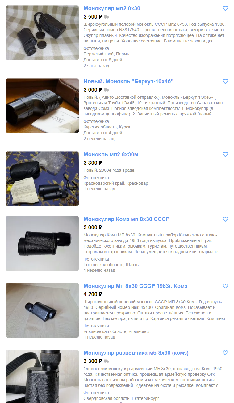 Котаны, кто шарит, поясните ньюфагу: 1)Бинокулярность нужна? За цену и вес бинокля, можно купить монокуляр выше качеством и большей размерности. И увидеть через него больше. Я прав? 2)Универсальный набор? Чтоб понять что к чему, планирую покупку аж трех биноклей: 8х32, 10х40, 15х50. Этого хватит на все случаи жизни. Бинокли с объективом меньше 30 и/или кратностью меньше 7 смотреть только мешают, а биноклями с кратностью больше 15 и объективами больше 50 - невозможно использовать с рук. Брать планирую отечественные поделия с Авито - так дешевле всего. А когда уже пойму, какой бинокль мне нужнее, можно будет подумать о покупке чего-то хорошего и современного, аж за 30к. 3)Бренды? Бинокли СОМЗ, ЗОМЗ и КОМЗ - одинаковы по качеству. Разница между заводами полностью теряется на фоне разницы между конкретными экземплярами. Современный импортные бинокли такого качества начинаются с 15-20к рублей. Все так? 4)Современный КОМЗ лучше советского/раннероссийского за счет новой технологии просветления. Но высок шанс купить неотличимую для нуба китайскую подделку. Юкон и Вебер - китайская срань.