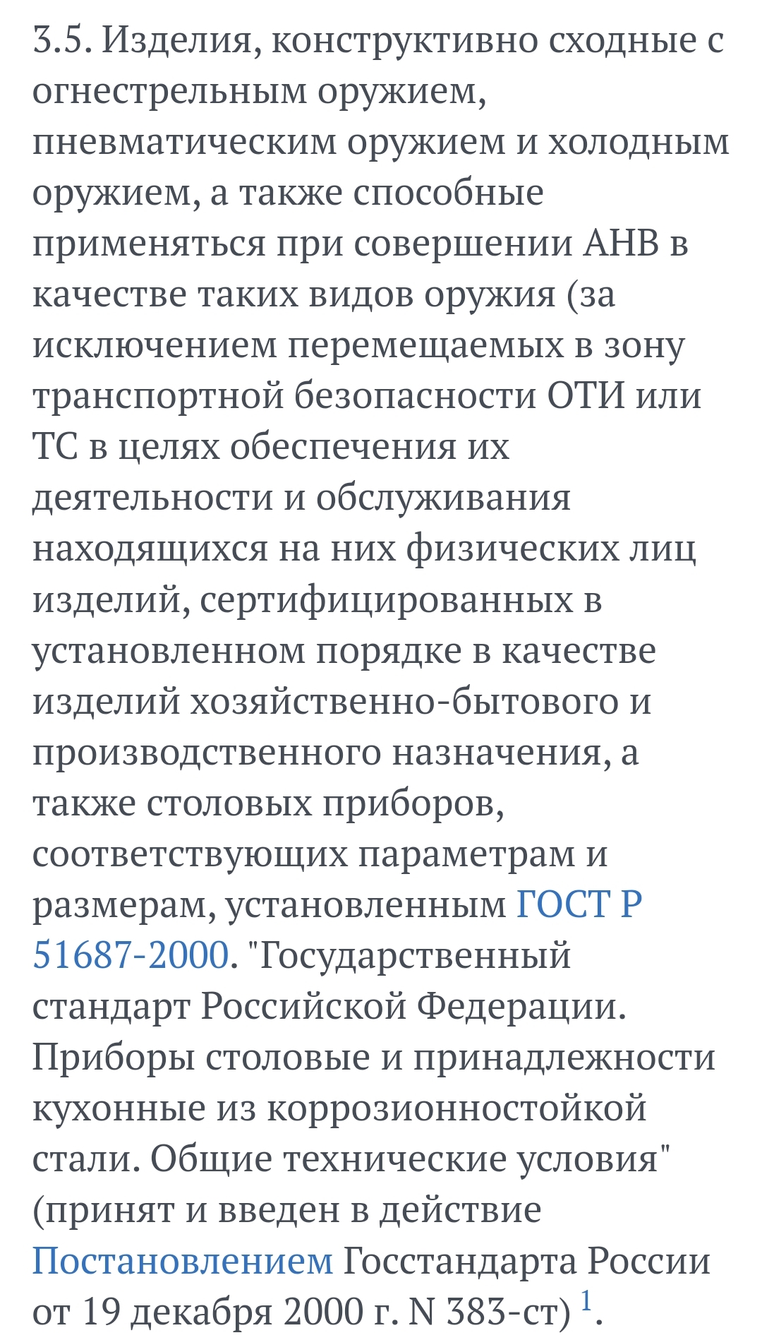 >>871061 (OP) Даже похожее на оружие низзя, также "способные применятся при совершении АНВ" - а это всё, что угодно. Тут уж как вахтёр решит.., меня не пускали с миниатюрным складнем; на просьбу дать определение ХО вахтёры "жидко срали себе в штаны" и грили, что "не обязаны мне ничего объяснять".