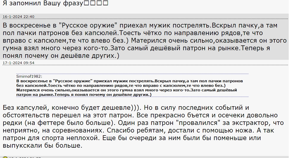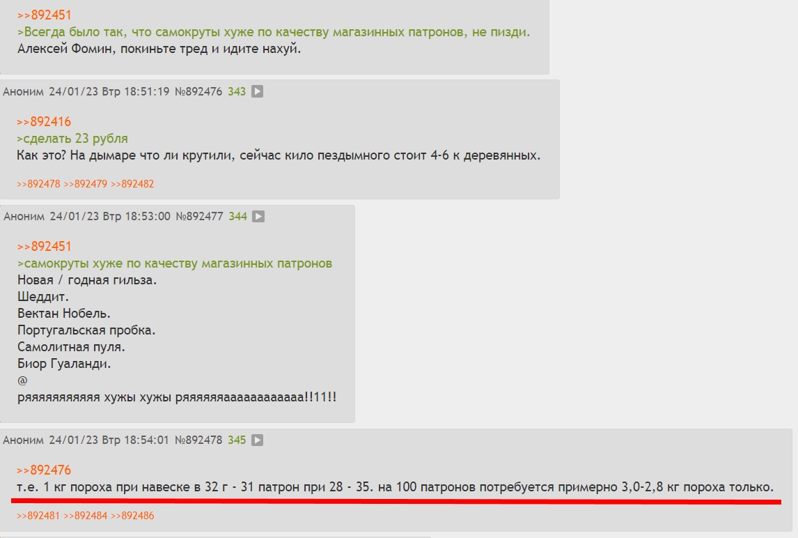 >>930134 >и импортный порох Ну вот. Понятно что Вектан и Сокiл стоили неодинаково, но тут ты сам решаешь. Нужны говнопатроны по гонгам на 15-20м? Колпачки Ли на Соколе, в контейнере Н10 с куском ДВП 20 калибра. На охоту? Нобель или Драго, всё по красоте, можно и в новые гильзы, если про запас делаешь. Тем мы и сильны (были), что крутим качественно и именно то что хотим. Но сейчас из того что есть, хули. При этом заводы тоже перешли на КВ-209 (норм капсюль вполне), а рекорд совсем сговнялся. Казалось бы - куда ещё? А вот есть куда. Импортные пороха для невысоких граммовок отлично замещал наш дешёвый тогда ТП-3. 1,1г на 28г заряда давал 360 м/с и 65 мпа в стволе, стреляй хоть обстреляйся, тарелки бить можно было очень дёшево. А теперь всё, пизда.