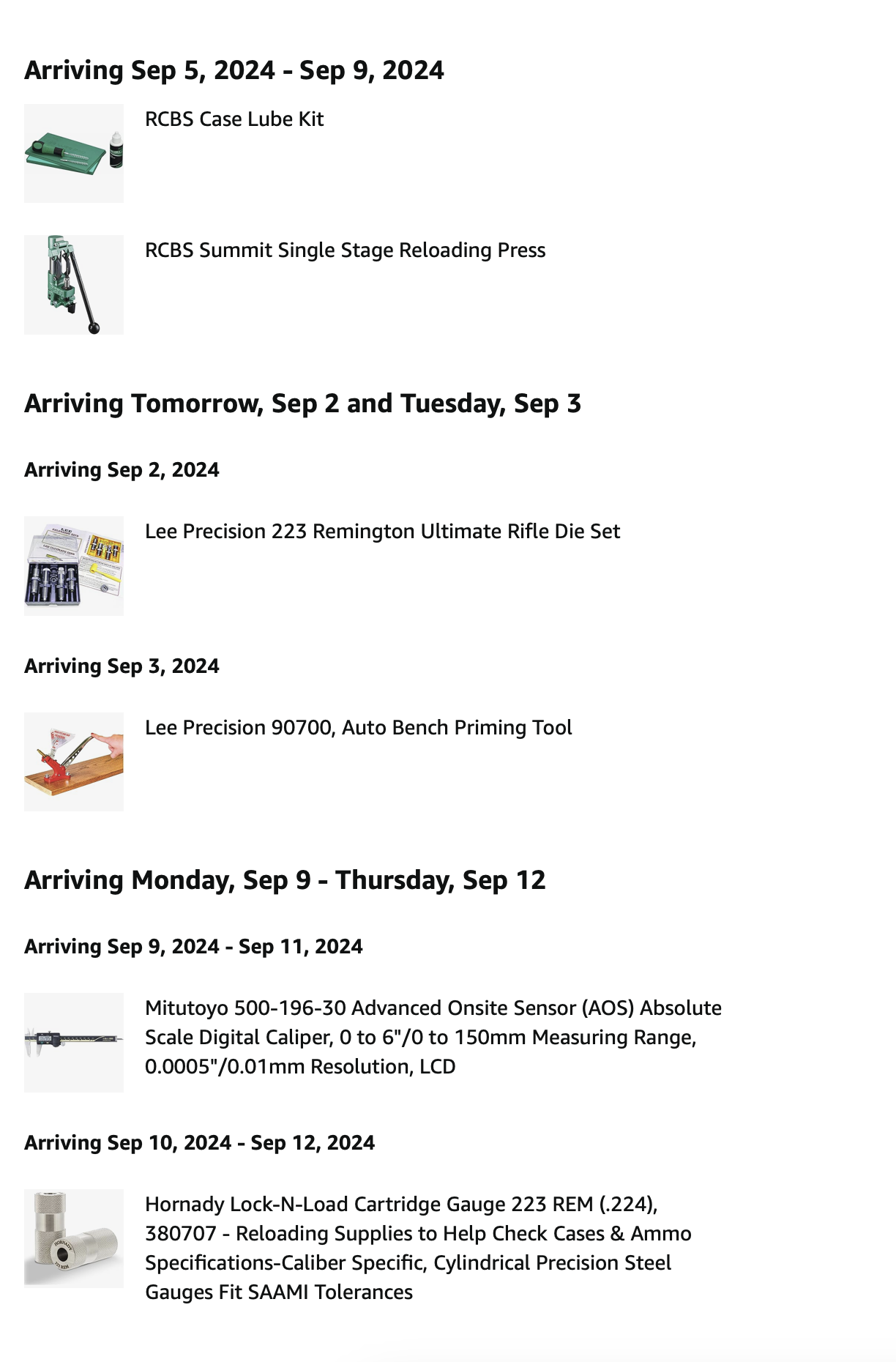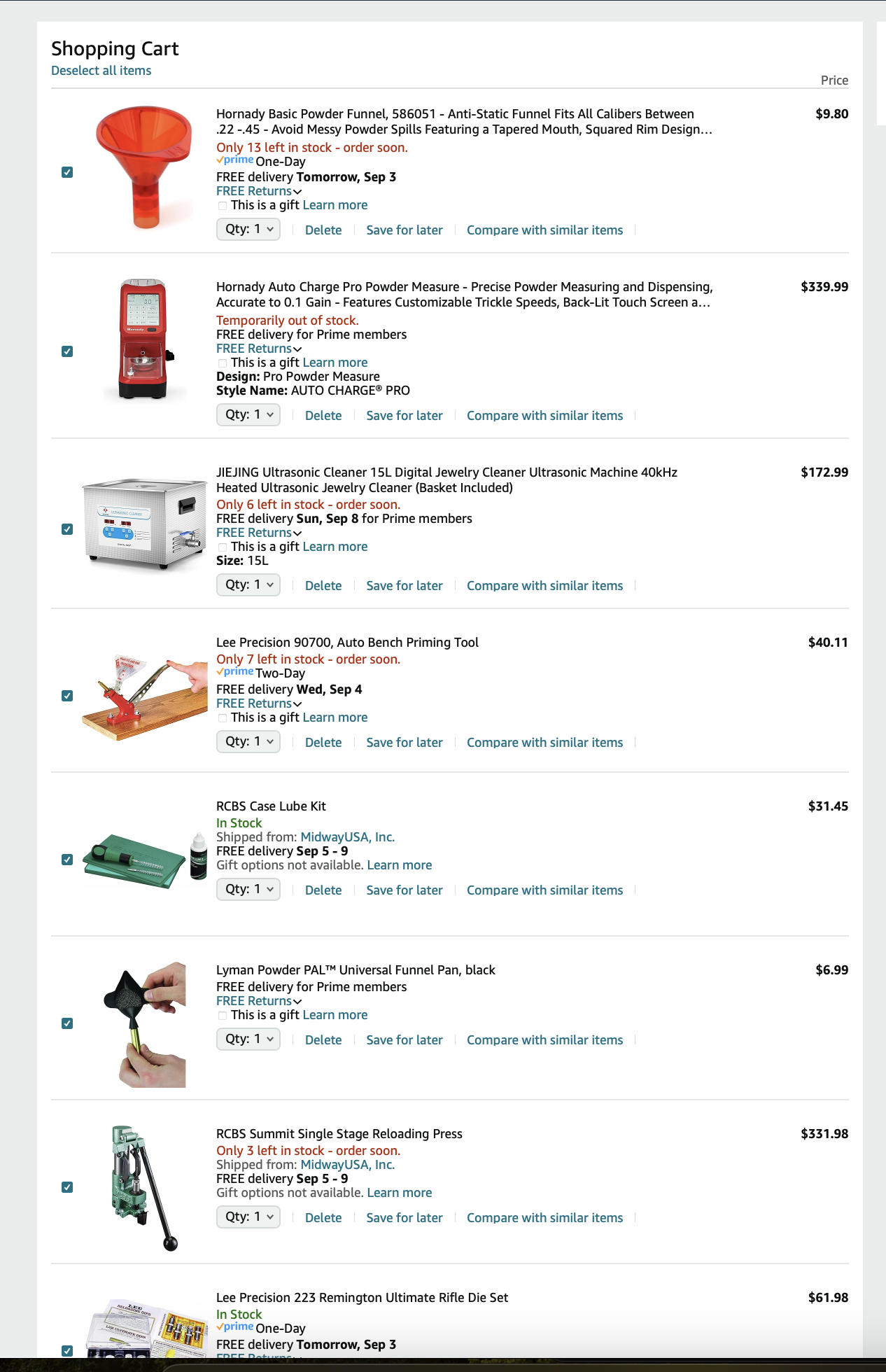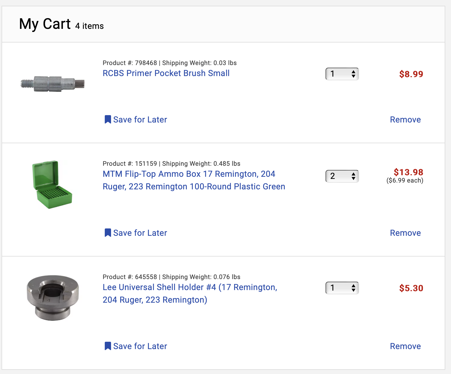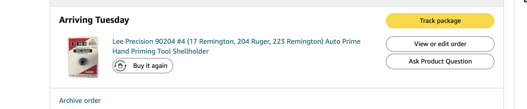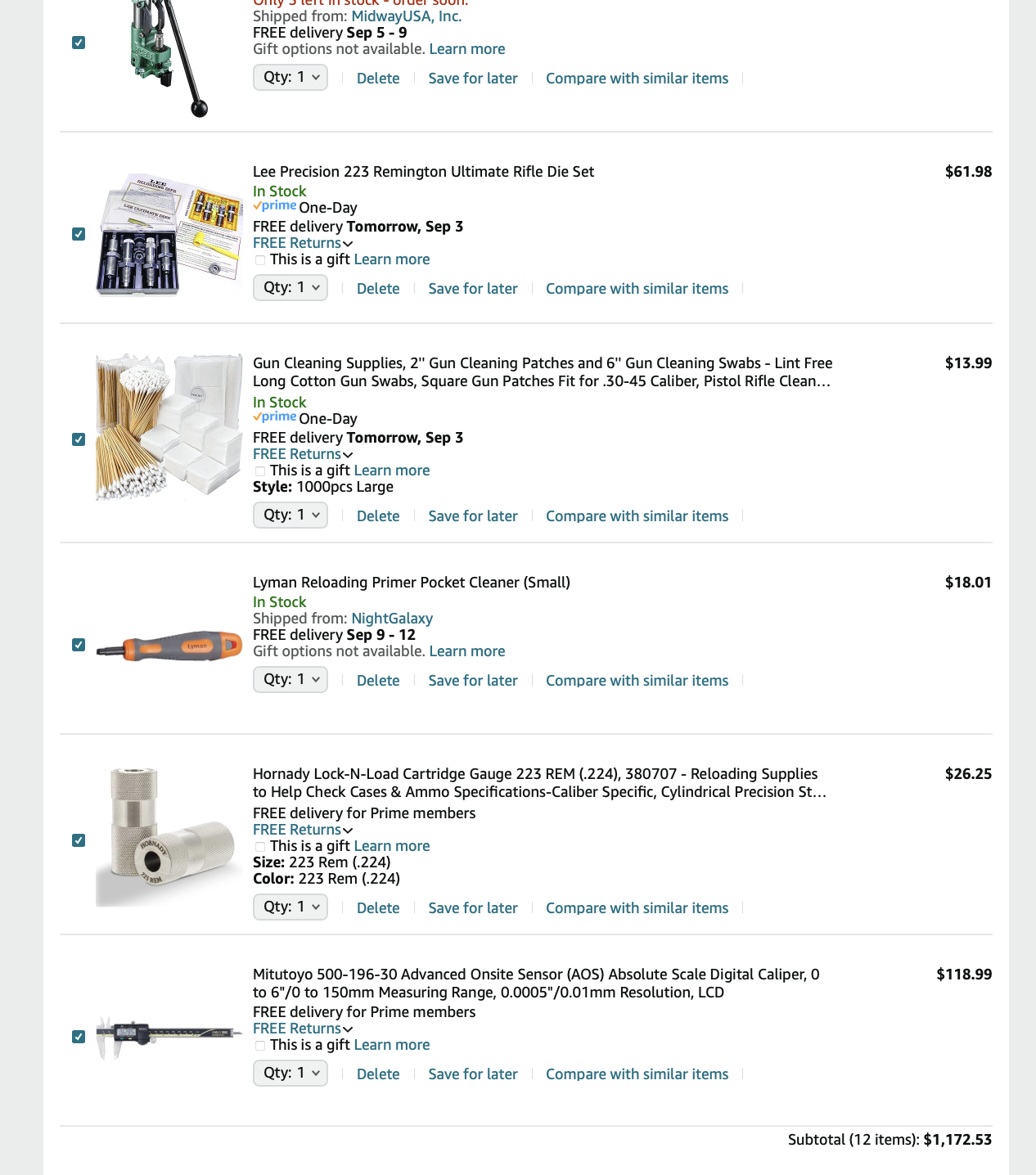 Матрицы в последний момент поменял на Redding 68111. И они в отличие от Lee тоже идут без шеллхолдера. Дозаказал шелходер для капсюлятора, Так же заказал всякую мелочь на MidwayUSA чтобы добить наебаллы и заказать все остальное нужное за бесценок.