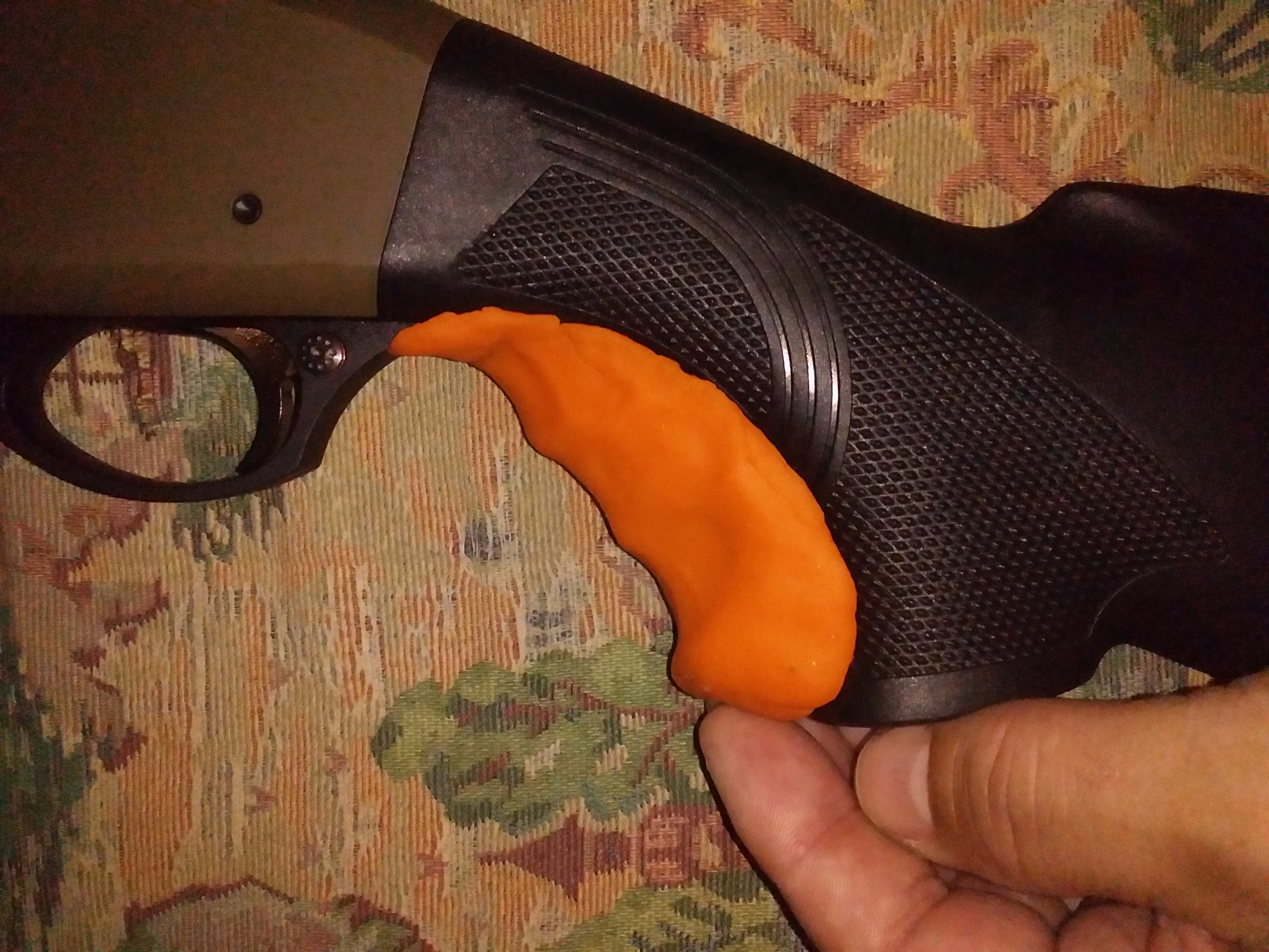 Точно знаю что здесь есть мудрые аноны, а не только пукнутый с рознорядкой. К вам и вопрос. пукнутый, а ты иди нахуй Купил ружьё с прикладом-веслом, а он оказался неудобным. Чтобы его держать, плотно обхватив пальцами, нужно неестественно выворачивать кисть. А когда держишь удобно, то под мизинцем и безымянным пальцем пустота. Возник вопрос: как доработать приклад, чтобы удобно было держать? Чем создать то, что сейчас из оранжевого пластилина? Смотрю пока что в сторону эпоксипластилина. Что ещё подскажете? Весло купил сознательно, пистолетка есть на другой помпе, здесь нужно весло. Магпуловских вёсел-прикладов на турков нет.