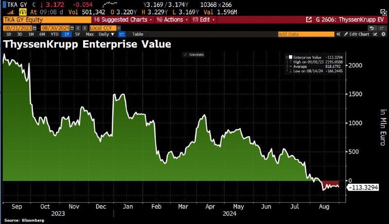 Некогда могущественный промышленный гигант Германии ThyssenKrupp сейчас торгуется на бирже, не имея никакой ценности.