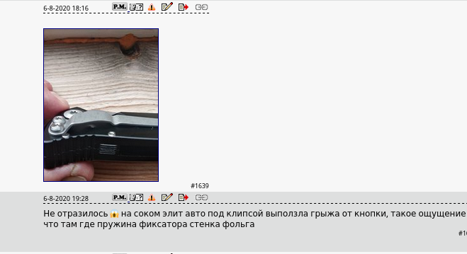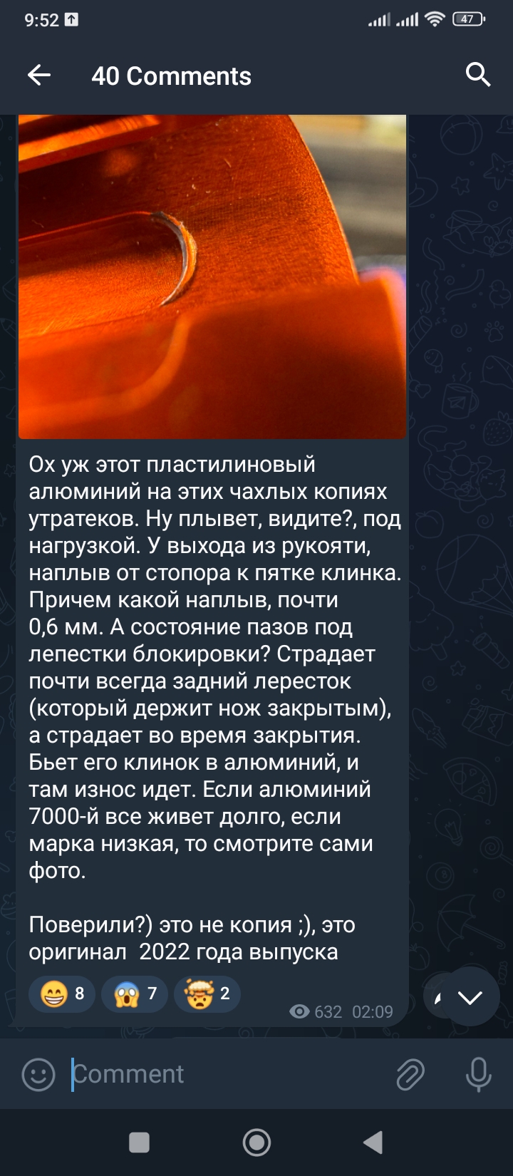 >>955695 >>955705 >Полностью двачую. На моем синем точно так же наклеп в конце направляющей стоп-пина, я аж сам охуел когда разбирал, ни на одном китайском такого нет Собственно, вот пикча. Разбирать антохино говнецо ради более подробной фотки не буду, уж слишком геморно оно собирается обратно, в отличии от старой модели или любой другой фронталки. Когда в прошлый раз разбирал, чтобы провести ТО (опять заедать начал, пришлось почистить и адекватно смазать), то я прям отломил от корпуса этот наклёп и знатно охуел, так как ничего подобного нет даже на моем дешманском оранжевом чагатеке от Hifinder. А на антохином есть. >>955707 >Но у мохнатого действительно такая позиция: я мол в этих ваших брендах и ножах не шарю, я ремесленник. Да ему и не особо нужно. По-хорошему, без каких-то особых знаний, трудно отличить оригинал от китая. Особенно, если китай сделан качественно. Я когда пилил обзор-сравнения ультратека, то подметил дохуя и больше различий, но они настолько мелкие и незаметные, что не знающий человек такое не определит, особенно если нет под рукой оригинала. С какими-то пидорками, наверное ещё сложнее. >>955712 Чем тебе фронталки не угодили? Да, спиннер, и что? >>955736 Куплен микротек, не микротек, микротек который не микротек, китаец который совсем китайский китаец и что? Нахуй тогда вообще тред нужен, если тут у всех (ну почти у всех) уже есть нож?