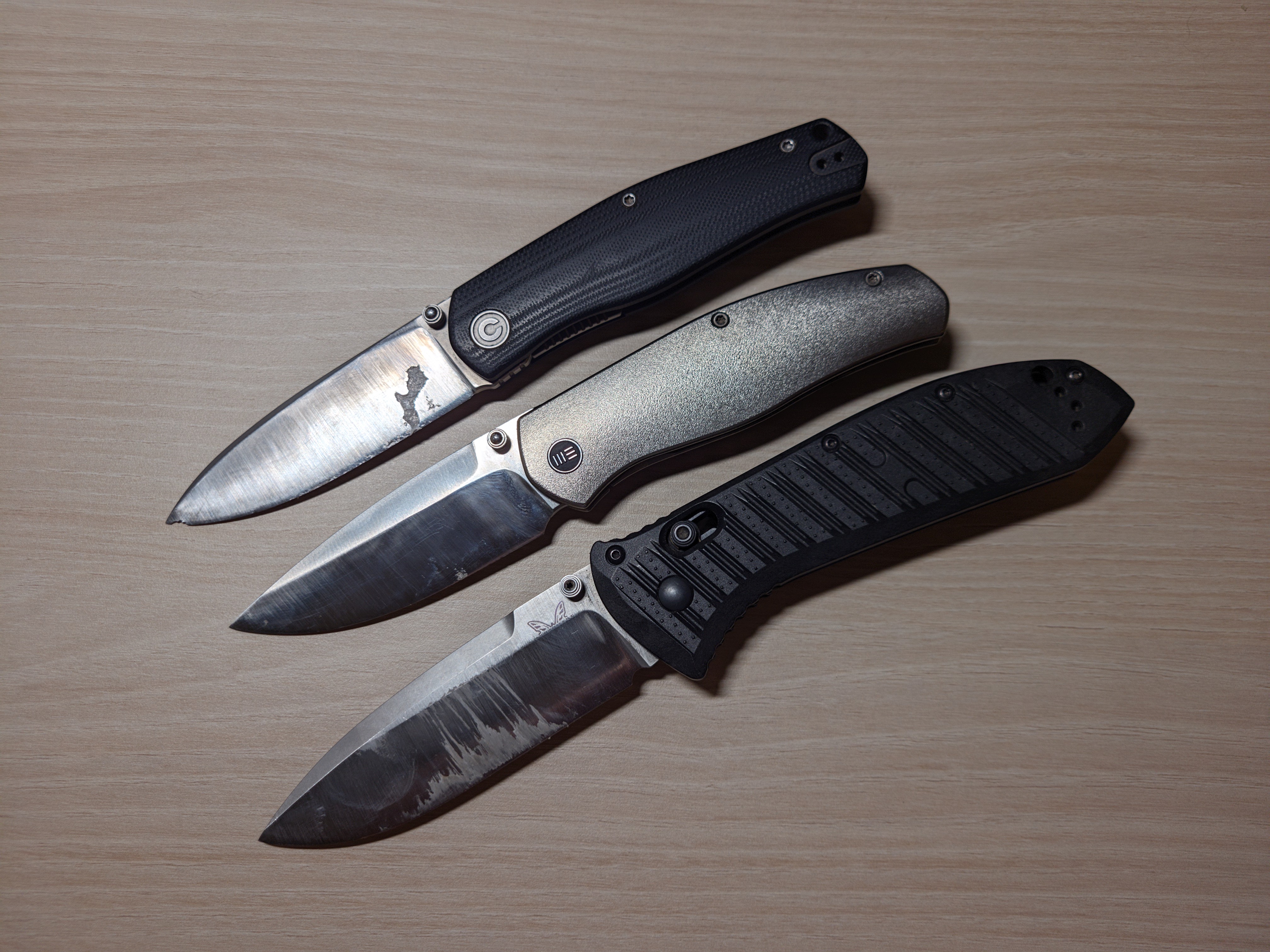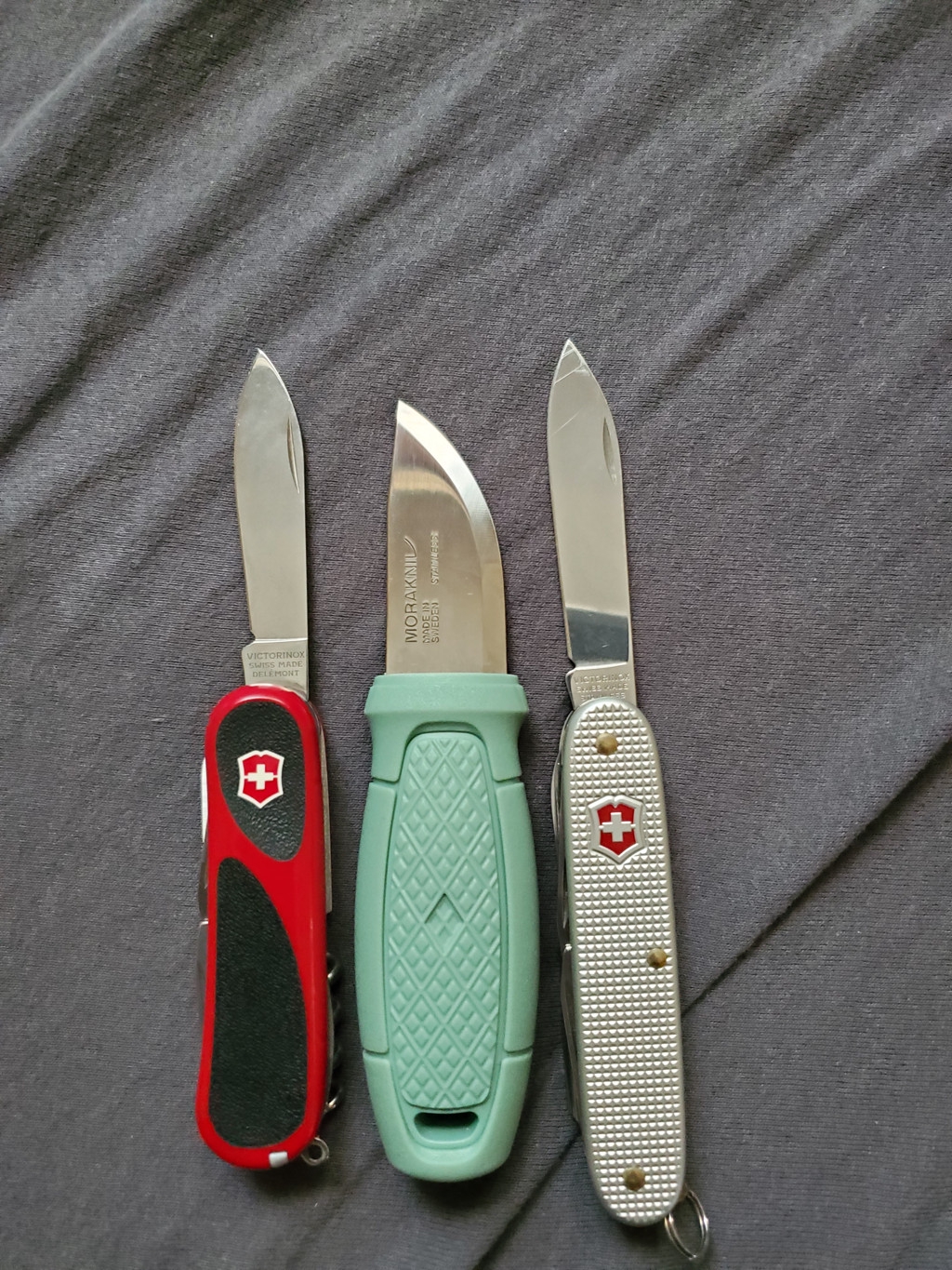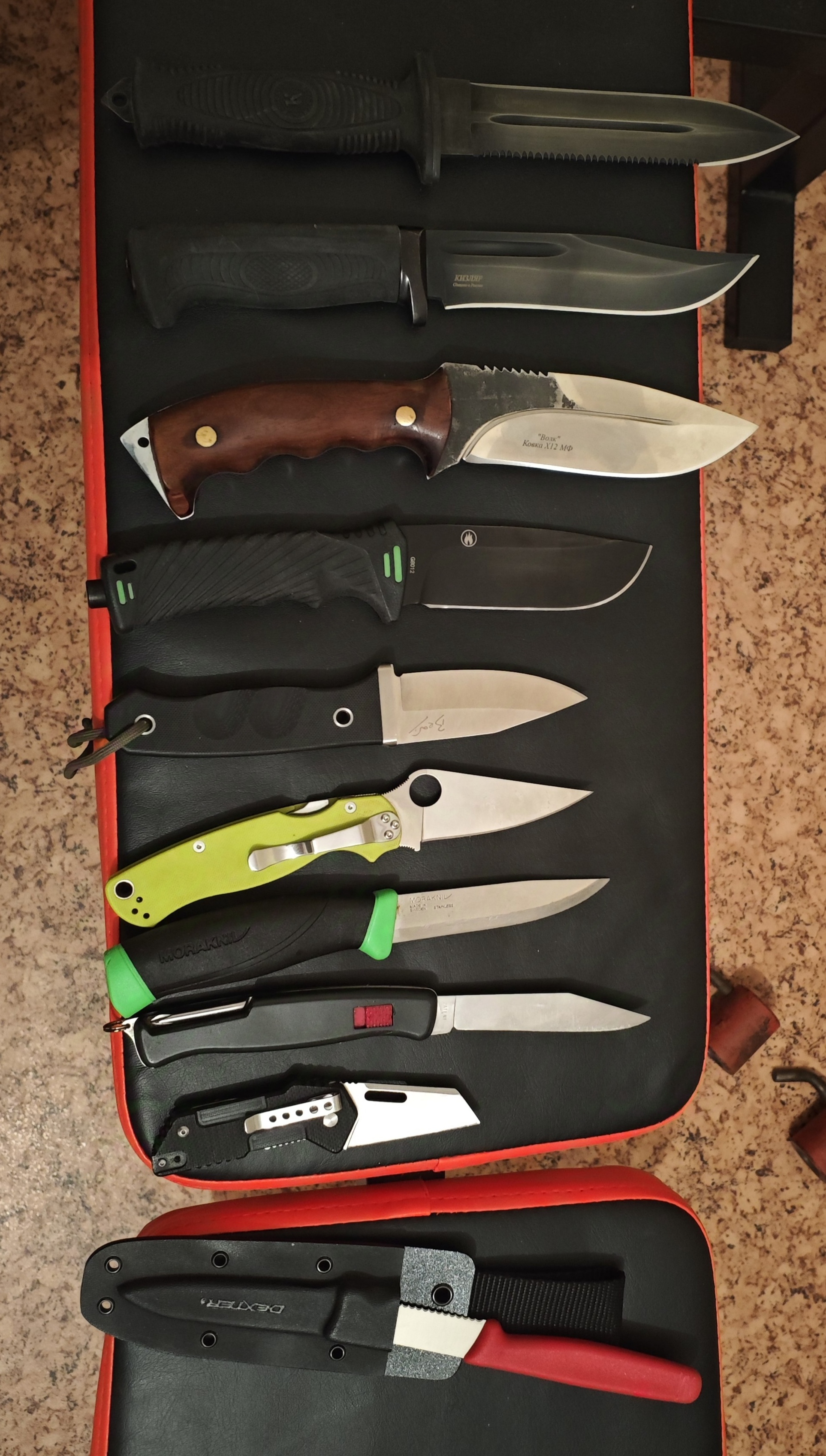 Вкачусь в тред со своим говном, что осталось, были всякие спайдерки, моры 2000, охотничьи кастомные итд, что-то терял, ломал, дарил... Первый (сверху) лежит тупо в коробке хз зачем его брал, с вторым иногда хожу в лес, третий использую как лагерник, когда на охоте или рыбалке, валяется в рюкзаке, по дереву рубит, строгает ваще класно это его прям стихия. Ганзо лежит в двери тачки (често не помню давно, нахер я его купил).Кастрированный китаец по мотивам бергрилза тоже тупо в коробке лежит, стилклавовская "спайдерка" , куплена вместо спайдерки которую потерял, иногда таскаю на кармане, иногда в бардачке, сейчас в прихожей в ящичке лежит, вскрываю ей всякие посылки и упаковки. Ну морка, иногда беру на рыбалку, но в основном там у меня филейный нож, так как я с Камчатки, а рыба у нас крупная, а так морка на кухне, сало с морозилки нарезает. Викторинокс, старый, такой по-моему сейчас не делают с такой кнопкой для лайнера, самый юзаный из всех ножей, прошëл огонь и воду, рыбалки, охоты, отрывалась плашка, клеил лактайтом, забивался песком и солью от морской воды что его хрен закроешь , а потом откроешь, реально неубиваемый нож, сейчас лежит в коробке с инструментами. Мелкий этот китаец, тупо для нарезания плюх, По-моему для этого и брался, случайно, больше я им ничего и не резал. Викторинокс с Красной ручкой использую на рыбалке, целая куча их у меня, с чëрной ручкой, я тралмастер, такие ножи используют на палубе рыбаки сейчас везде, серейторные, от амеров с нулевых годов пошла мода, ну другими данему и жилковые верëвки не порежишь. Есть ещё пару кастомных охотничьих, на даче.