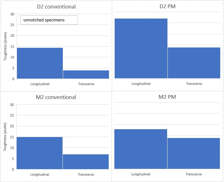 Что касается низколегированных сталей, то 1.2562 и Blue Super с их относительно высоким содержанием вольфрама показали себя не так хорошо, как я ожидал. Эти стали образуют твёрдый карбид вольфрама WC, который не встречается в других высоколегированных вольфрамовых сталях, таких как быстрорежущие стали. Я думал, что они будут ближе к 400–450 мм, основываясь на отчётах об износостойкости аналогичной стали F2 из старой книги «Инструментальные стали». Этому есть несколько возможных причин. 1) Вольфрам — очень тяжёлый элемент, поэтому даже 3% вольфрама дают чуть меньше 2% WC. 3V с 2,75% ванадия вместо этого содержит около 5% VC. 2) Карбиды вольфрама, наблюдаемые на микроснимках Blue Super и 1.2562, были относительно крупными и располагались далеко друг от друга, поэтому, возможно, карбиды были настолько рассредоточены, что не всегда оказывали влияние на кромку. 3) Значительная часть карбида в этих сталях представляет собой цементит, который, судя по всему, никак не влияет на сохранение остроты кромки в этом тесте, как описано выше.