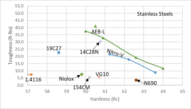 >>962122 С чего ты это взял? В видео по ссылке чувак сделал ножик из 3V, одной из самых стойких сталей, и издевается над ним. Так вот, при 60 HRC AEB-L в плане ударной стойкости и ломкости лучше, при этом, разумеется, показатели износостойкости и способности удерживать кромку у неё ниже. AEB-L и 14C28N входят в группу самых вязких сталей вообще. https://www.youtube.com/watch?v=SIgVvpjcEa4 PS. CPM-3V — инструментальная порошковая сталь повышенной прочности и износостойкости с высокими показателями по ударной вязкости и силовым нагрузкам. В этом видео ты можешь посмотреть на то, как ведут себя стали, закаленные ещё выше: https://www.youtube.com/watch?v=rY8IFivjcGA