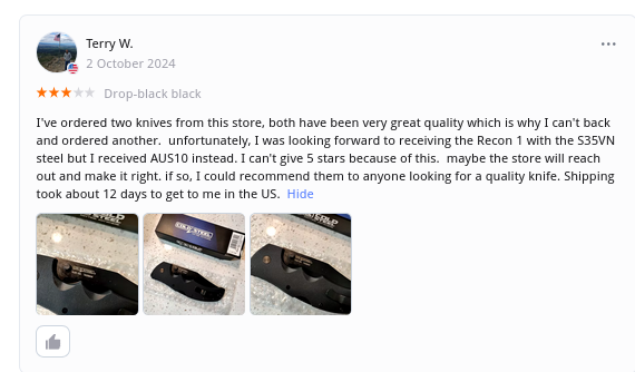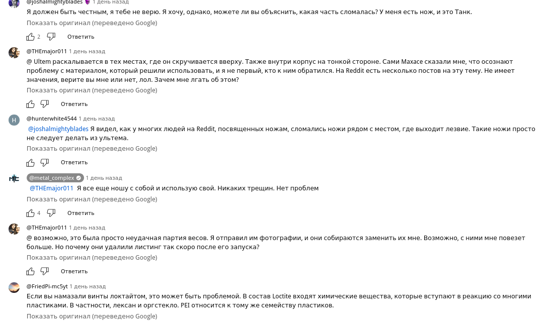 >>963610 Понеслось говно по трубам. Ютубер gvg4 metal complex облизал maxace neptune, одна беда, в комментах стали появляться люди у которых эта хуйня лопнула. В ответ автор стал обвинять их в пиздабольстве. (https://www.youtube.com/watch?v=CY_OoEn81QU) Потом порвалась сабветка реддита о китайских ножах, на которые и всплыли первые фотки брака. https://www.reddit.com/r/chineseknives/comments/1gs3p26/maxace_and_metal_complex/ Тем временем Медуза в ультеме тихо пропала из продажи. Злопыхатели утверждают что из-за гигантского количества брака была снята с продаж. Поклонники - модели такая охуенная, что была раскуплена.