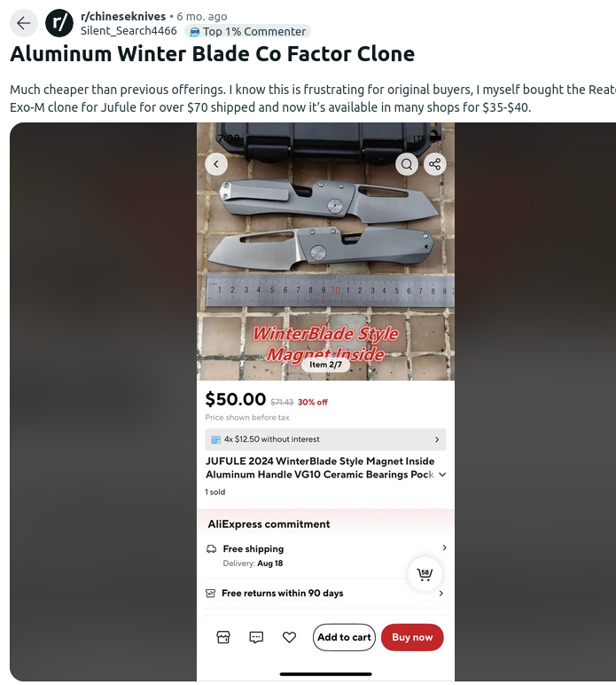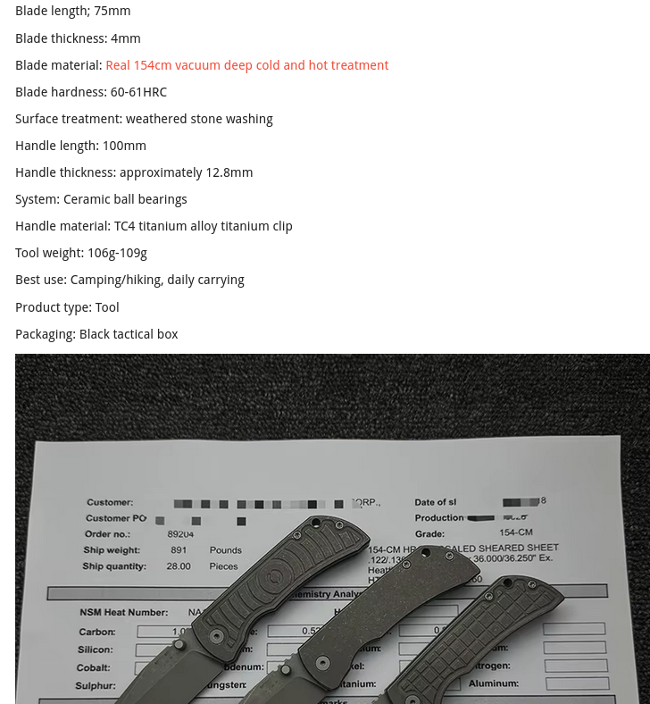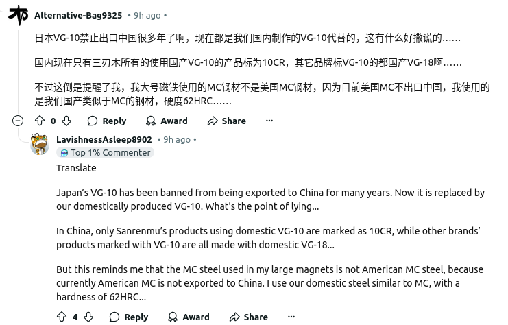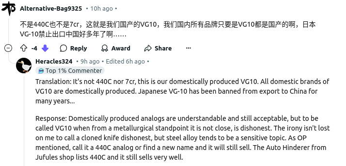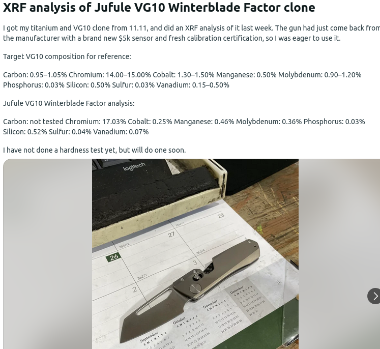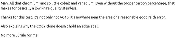 На реддите драма - сделали анализ титанового спиннера с vg10 от jufule, и кто бы мог подумать, там не vg10. В комменты пришел какой-то китаец (уж не сам ли) и заявил, мол идите нахуй, японской vg10 вне Японии вообще нет, запрещена к экспорту, у нас свой аналог, а маркируем как вг10 для тупых лаоваев. Только у санренму хватило яиц маркировать ее как 10хром.