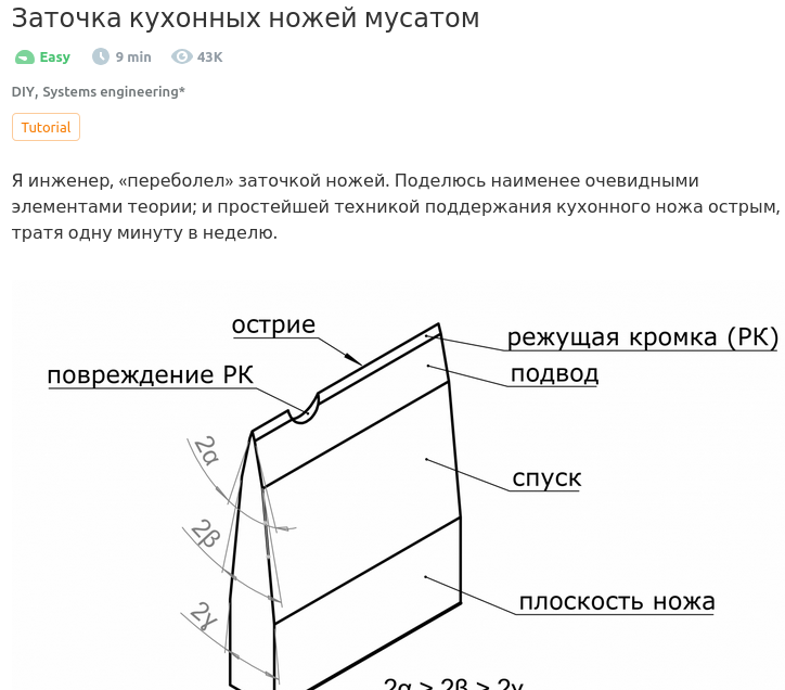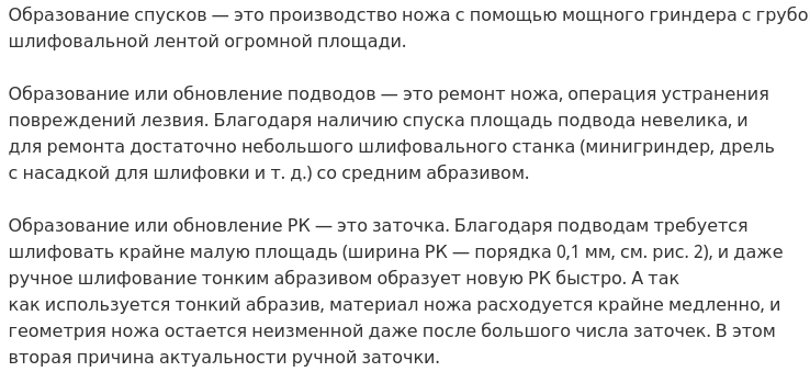 >>965656 Непрофильные компетенции уровня хабра, избранное: >В мусате наиболее благоприятным образом сошлись все принципы заточки. >Лайфхак: слушайте характер шуршания стали по керамике, и ощущайте это шуршание рукой. Когда режущая кромка будет сформирована — звук и ощущения в руке изменятся. Через некоторое время удерживать углы можно будет по звуку; и на слух же понимать, что необходимая острота достигнута. >А я пришел к тому, что излишняя заточка для кухонных ножей даже вредна, т.к. увеличивается травмоопасность и сильно повышаются требования к координации, причем сразу для всех домочадцев, включая детей. Лезвия, о которые режешься при неудачном касании - хороши как сувенир. >Поэтому пришел к грубой заточке на болгарке с регулятором оборотов обдирочным кругом. Это формирует пилу и не очень острую кромку. Пила отлично работает при режущем движении, зато не очень острая кромка спасает, если кто-то схватится за лезвие. >Оказалось, что засаленный камень крупной зернистости может привести к неожиданному эффекту — упрочнению металла за счёт "микро-ковки". >Я купил в Икее набор керамических ножей и за 5 лет они не потеряли достаточных для кухни режущих свойств... >Достался мне нож Tramontina, один на всю кухню. И рядом лежал треугольный напильник. Нужно было быстро подточить нож, поэтому решился на варварство - как нож об нож, только о напильник со "средней" насечкой. И мне понравилось - я быстро делаю зазубрины, они быстро режут всё подряд, за год не увидел стачивания лезвия.