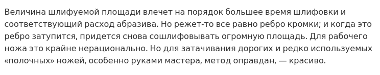 >>965322 Довольно тонкое означает 0.2-0.3. >>965325 На домашней кухне правят нож перед началом готовки. Если ты готовишь раз в 3-4 месяца, то да, раз в квартал. Если каждый день — то каждый день. Хотя я видел в гостях ножи, которые не точили пару лет с момента покупки, мало того, и точить-то нечем. Они тупые абсолютно, их режущая способность недалеко ушла от стальной линейки, можно руку пилить острой стороной и кожу не поцарапать, "режут" только за счёт геометрии первичного сведения и приложения больших усилий. Кому-то и так норм. Износ кромки у высокоуглеродистых твёрдых сталей немного другой, там кромка не заминается, а изнашивается. Её тоже можно довести до рабочего состояния незначительными усилиями, а перетачивать раз в год.