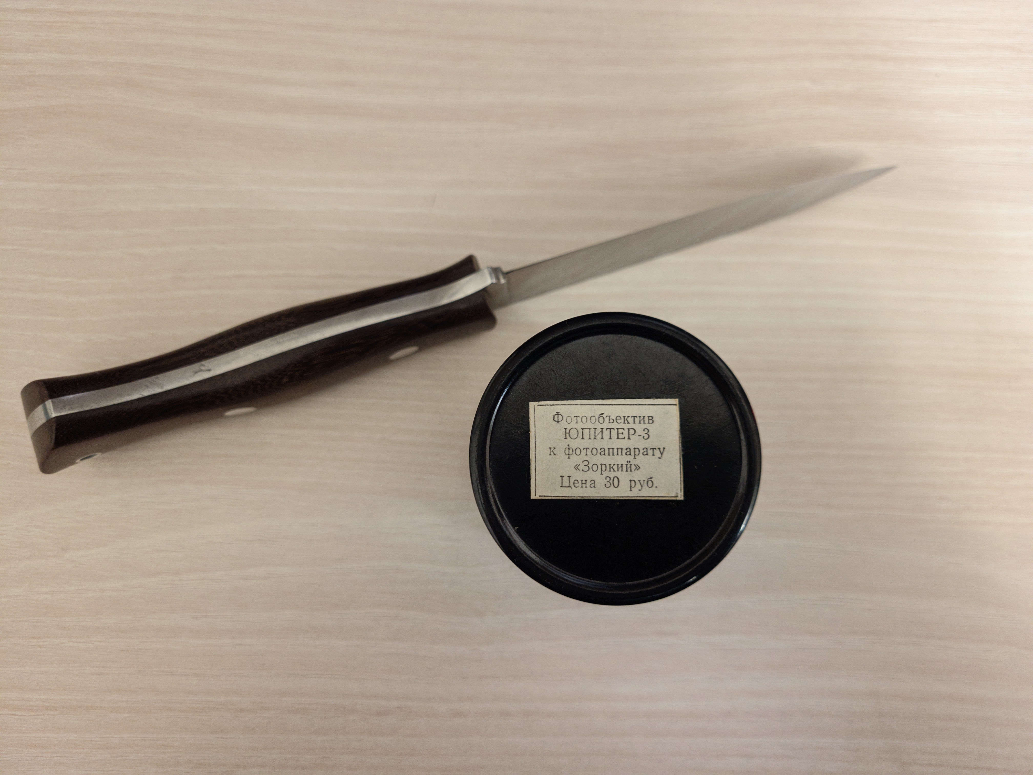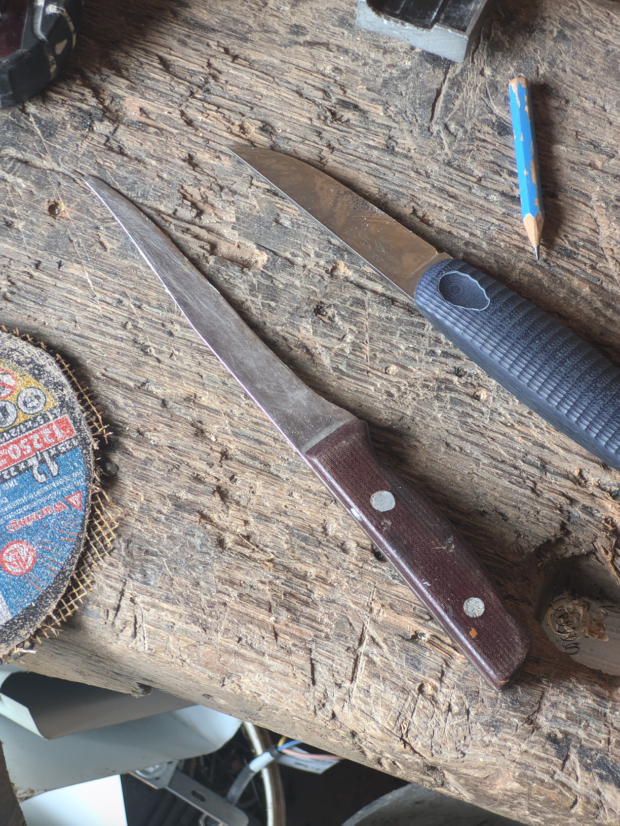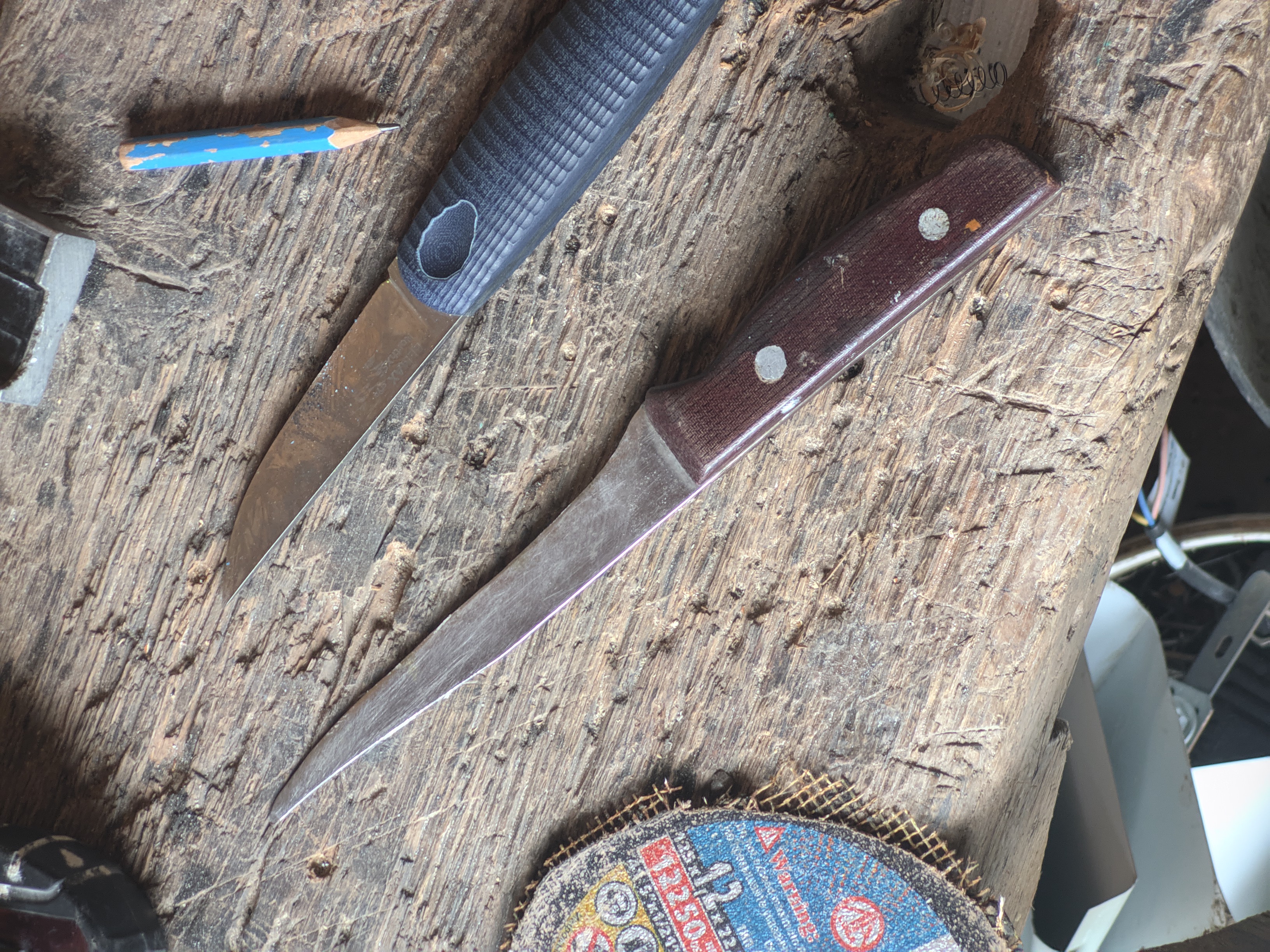 Нож слева: - Ежедневно служит чадам-хозяевам уже 30 лет и ещё походит десяток. - Точился исключительно обдирочным дедовским оселком. - Выдержал сотни поездок на шашлыки, рыбалки, по грибы, на дачу, в деревню. - Перерезал 50 тонн огурцов, помидор, капусты, картошки, морковки, лука, сала, мяса, рыбы, колбасы и хлеба. - Вспорол сотню куриц, пару тонн рыб и двух пьяных Петровичей. - Его рукоятка приобрела усреднённую форму руки хозяев, удобнее ножа букквально не найти.