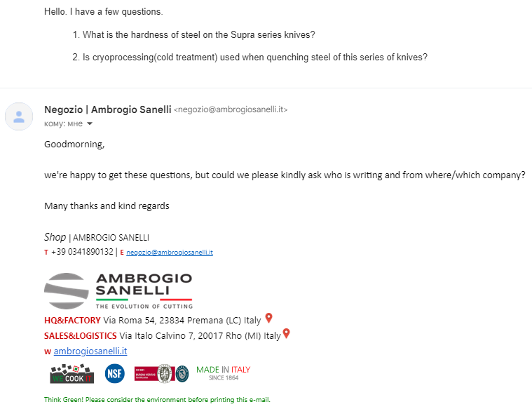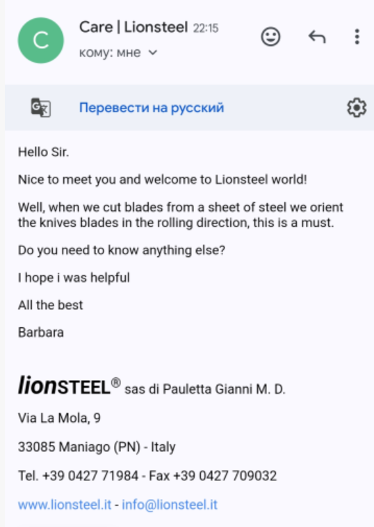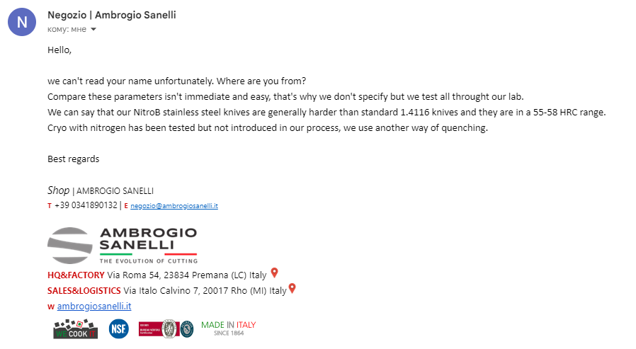 >>965757 Точно итальянская. Прадед Санелли начал делать ножи в своей мануфактуре в коммуне Премана 150 лет назад, там вся коммуна исторически пилит изделия из стали, всякое режущее, ножницы, бритвы (Fatip, например, оттуда) и ножики, стальные элементы спорт-инвентаря. Во-первых, у итальянцев из семейных контор весьма специфическая манера бизнес-переписки, могут как "мамой клянусь" пальцы гроздью, так и нахуй послать. Во-вторых, письмо подозрительное, типа "а чо там у вас по твёрдости и крио" — вдруг это не иностранцы, а семья Хуелли из другой коммуны, конкуренты. Что мне удалось узнать: в Nitro-B 14.5% хрома, не менее 0.5% углерода, не менее 0.1% азота (не более 0.2%), 0.7% молибдена и 0.15% ванадия. На производстве вроде есть азотная крио при -80 для некоторых изделий. Целевая HRC 57-59. Мамой клянутся, что у них получается равномерная микроструктура, пикколо карбидики, режет хорошо. Впрочем, режет хорошо. Там вообще довольно современная линия высокой степени автоматизации, выходной контроль твёрдости, полировки, заточки, есть CATRA. Большинство операция производится на автоматизированной линии, промышленные манипуляторы и все дела, контроль параметров тоже автоматизирован, углы на лазерном гониометре. В общем, уже не совсем мануфактура.