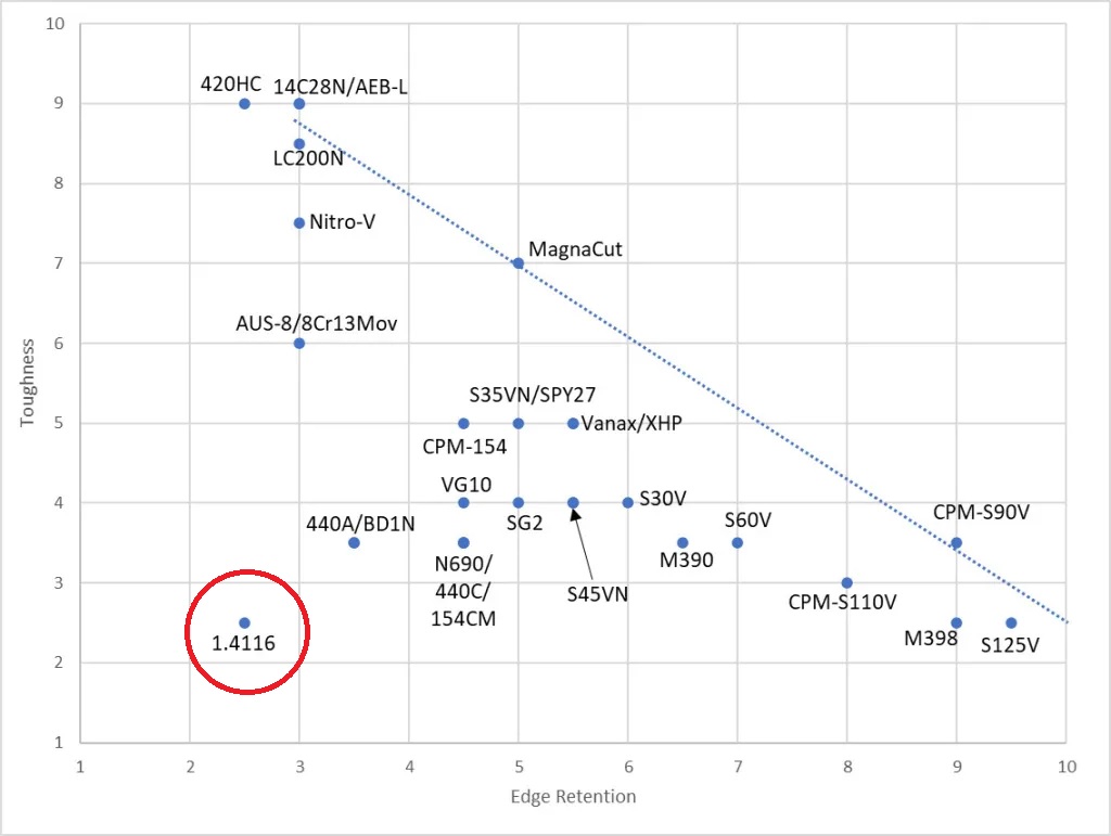 >>965813>>965814 А почему 1.4116, она же X50CrMoV15, популярная сталь для ножей, показывает такие хреновые результаты а плане удержания кромки и стойкости?