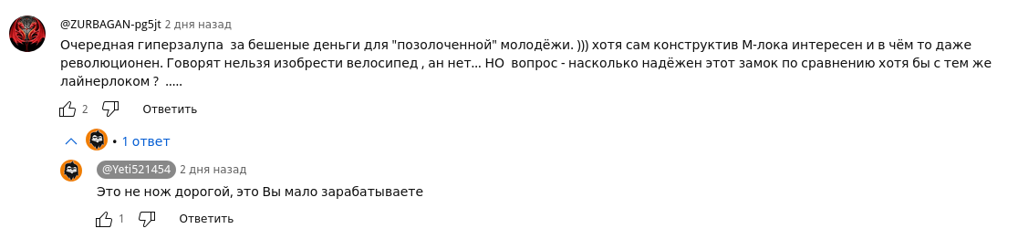 >>967197 Димаскус сказал что подшипник. В любом случае, тот же плохов вадик делал подобные тесты, и подшипники там показались самыми живучими. А первыми говна поели бэклоки. >>967215 Ага, только брал я его за 28.3к. Прикольно, конечно, но того не стоит, как и оригинальный чагатек. Веспа показала адекватную цену таким ножам - 15-20к. Но в отличии от антохиного чагакека, тут цена хотябы немного обоснована. Сталь так обработать намного дороже.