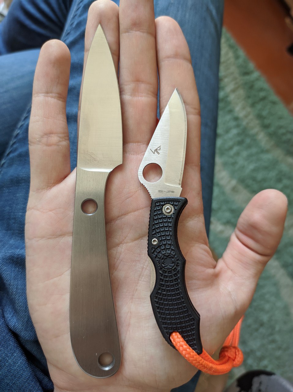 >>965130 > Никогда не понимал такие формы клинка, зачем? Комбинированный гринд? Суть в том, что на острие угол схождения спусков намного больше, чем на основной РК. В итоге, и острие не сколется при сильном ударе (т.к более ломовитое), и основная РК будет нормально резать, т.к сведение тонкое. >>965138 У тебя на картинке оригинальная японская форма танто, а стамеска с острым углом это американское танто.