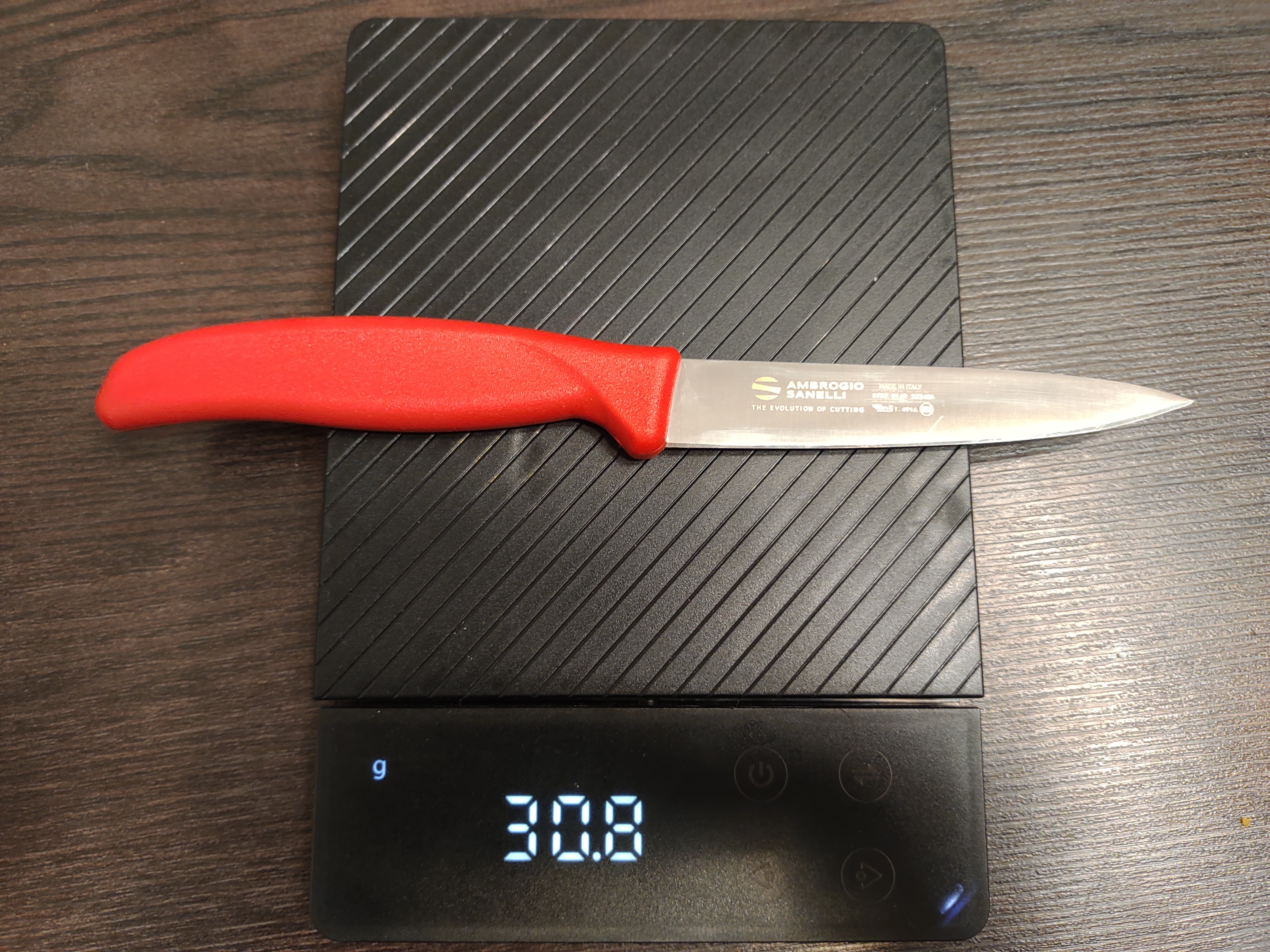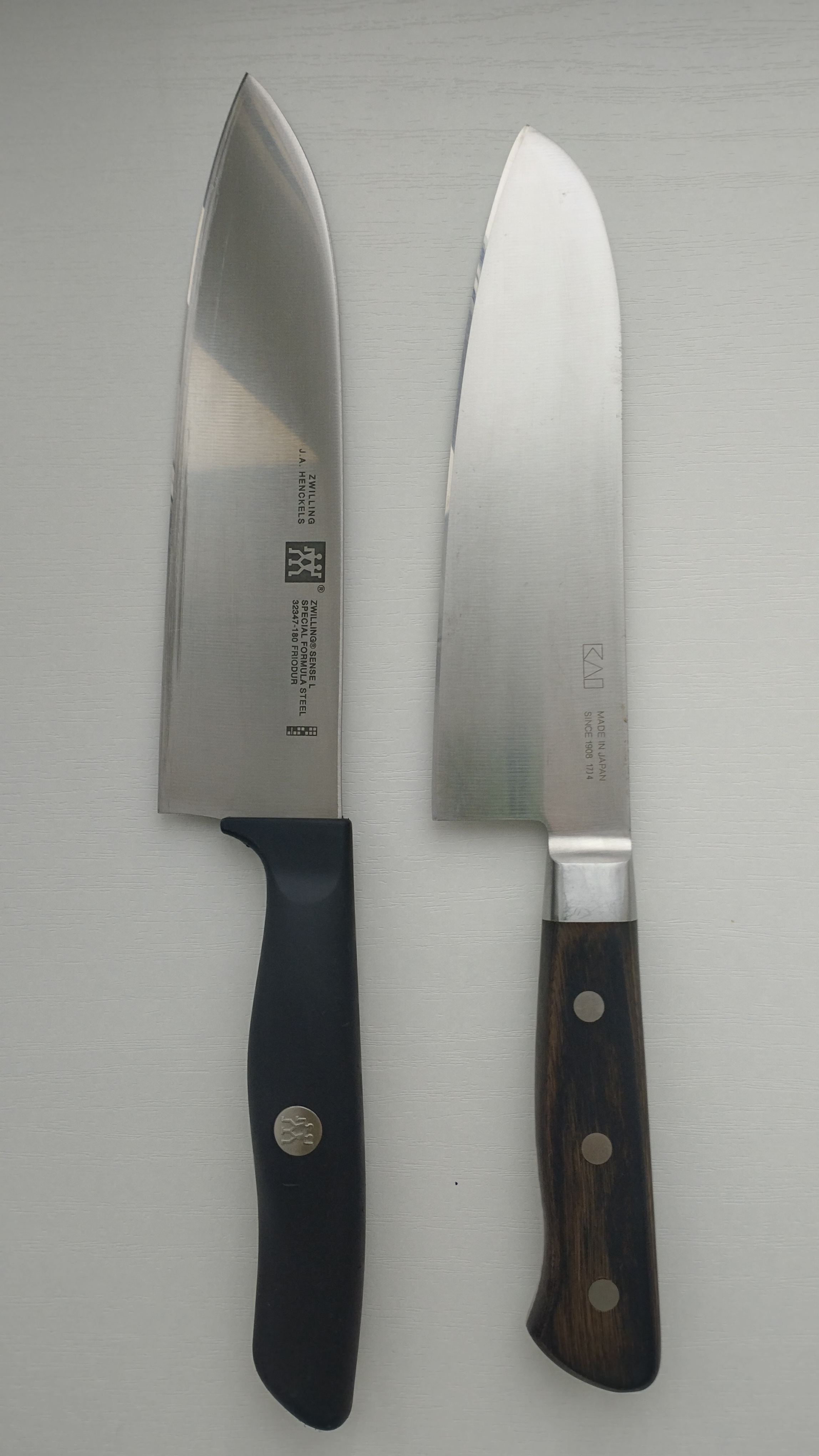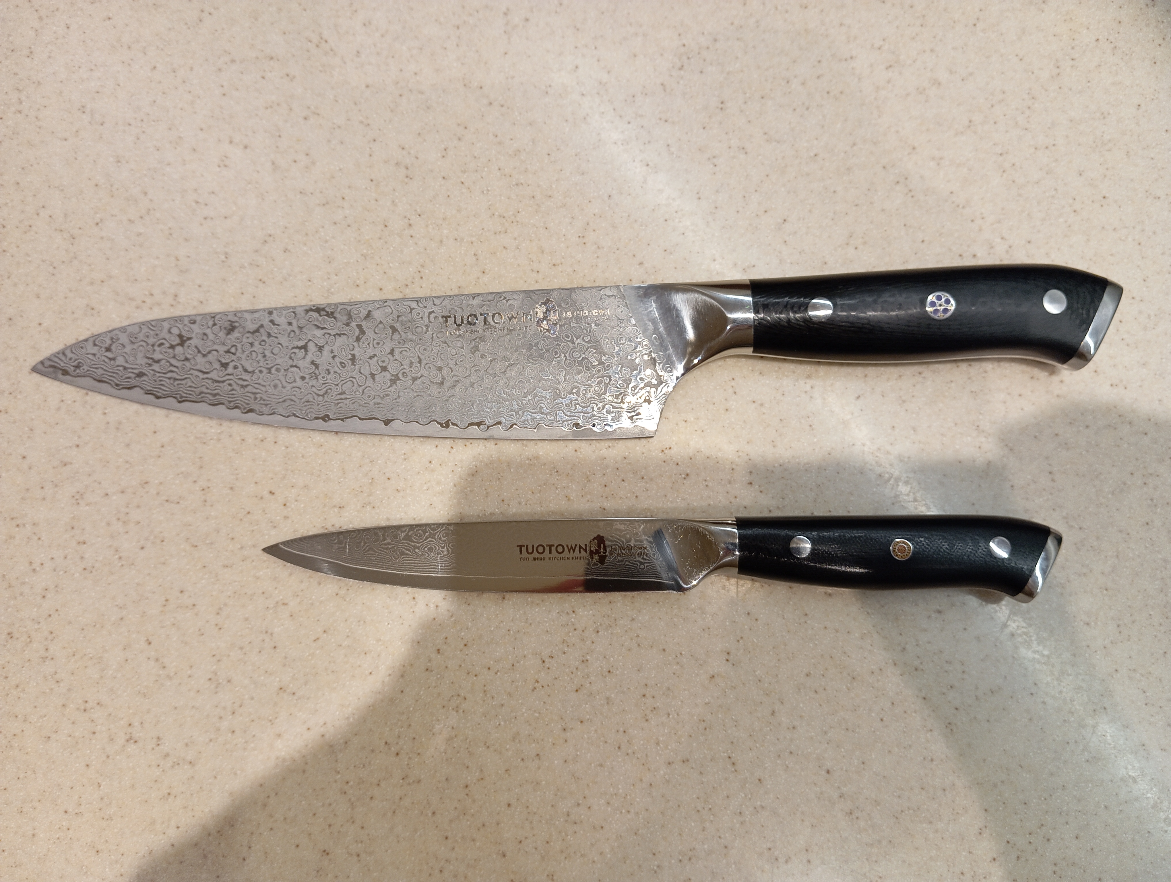 Нож справа: - Использовался соевым хозяином пару раз в неделю за последний год с момента покупки. - Не точился, поскольку не успел особо затупиться. - Однажды был в походе выходного дня. - Порезал пару пачек тофу. - Вскрыл дюжину коробок и упаковок. - Был открыт и закрыт пару тысяч раз раз просто так в качестве фиджета.