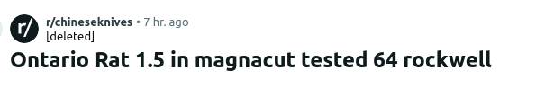 >>967065 На последнем скрине MC - про магнакат? То есть, он говорит, что магнакат не экспортируется в Китай, поэтому они используют "китайский аналог" с твёрдостью HRC? Вот это наёбка, если уж там вместо VG-10 вариация 440С типа 99Cr18MoV.