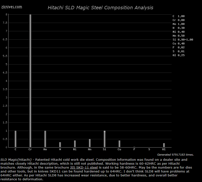 >>967166 Очевидно состав неправильный. Китайцы даже со скриншотами с Zknives наебывают. Типичная 8% хромовая инструментальная сталь для холодной штамповки. Коррозионная стойоксть на уровне D2